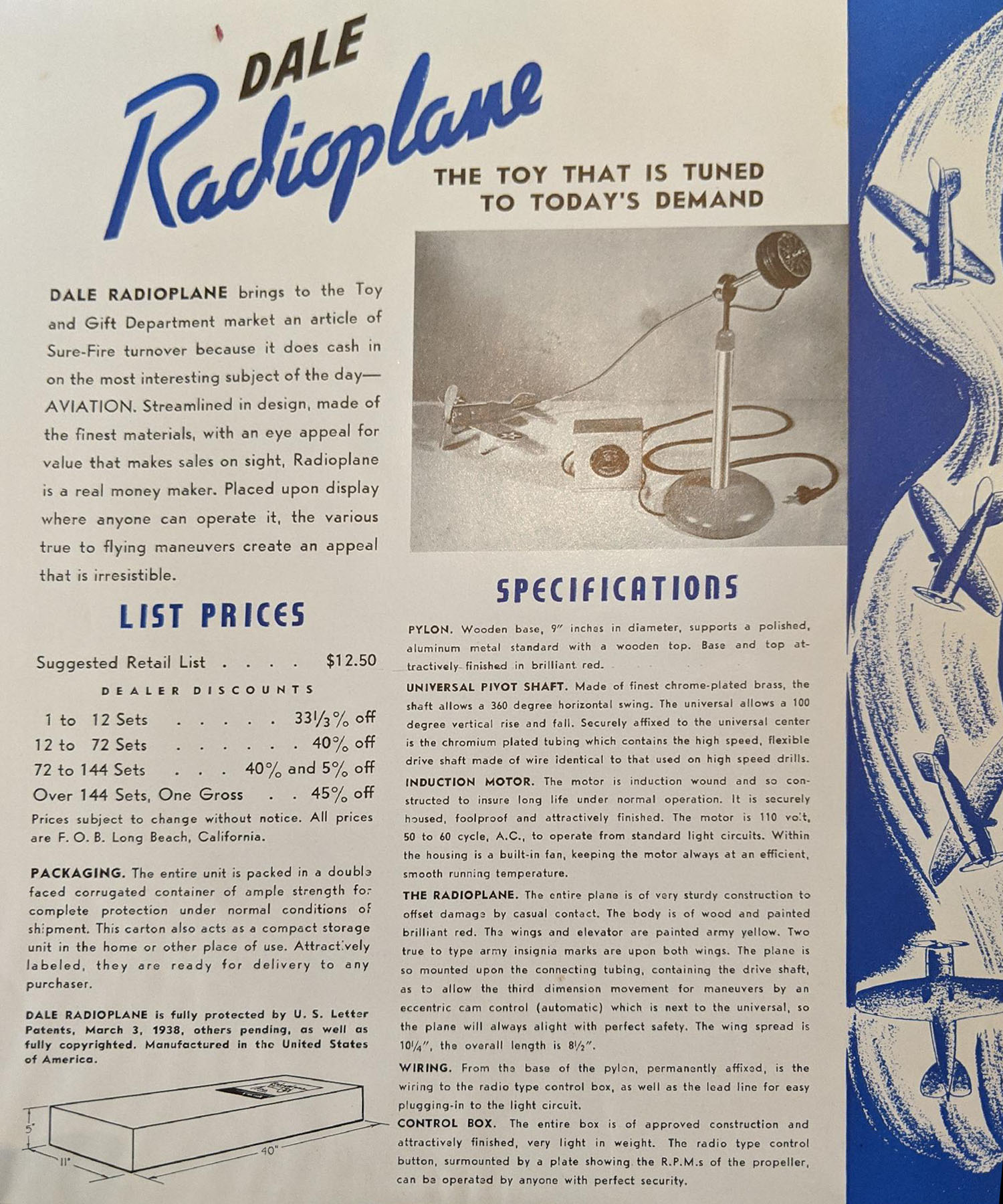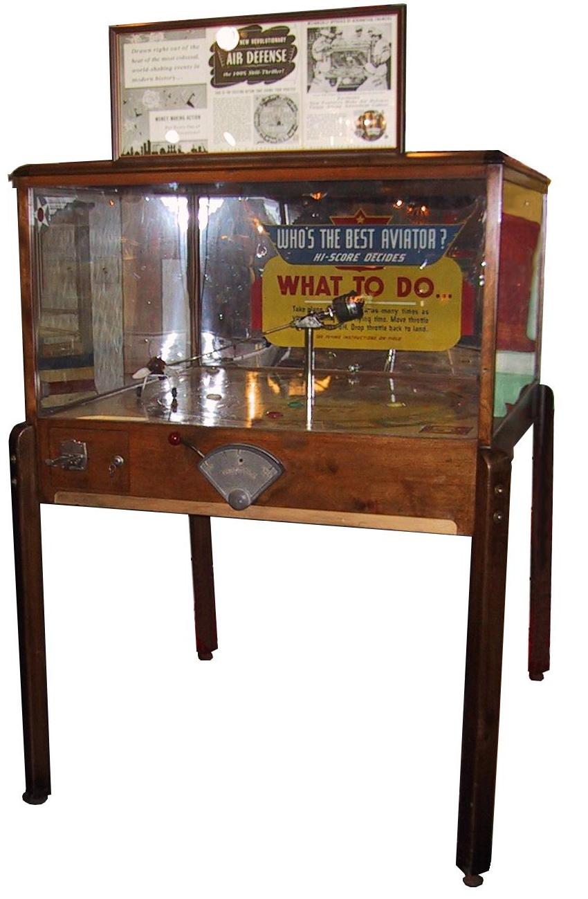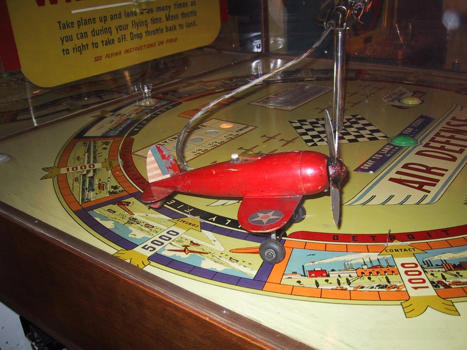 Description: Air Defense, C.R. Kirk, 10/40, distributed by International Mutoscope. Very similar to Jet Pilot (Chicago Coin/Genco 5/59). Fly the model plane in a circle to altitude, a green light goes on, then land on the appropriate playfield marker/switch. 5000 points scored for each unvisited location. The first ones are easy, but as the game progresses, it gets a lot harder to get an unvisited locale (city.) The game is timed, so you have a limited time to get all the locations. The original design for this game came from a $12 toy. An obsessive inventor/pilot Eldon Dale moved his toy airplane company from Kansas to California. There he produced a home version toy of what he eventually sold to CR Kirk for their Air Defense game. (Eldon Dale was the guy who designed the upright gun game using mirrors after WW2.) Dale patented the Dale Radioplane toy in 1938, and sold the rights to C.R. Kirk after that. Hence they turned his Radio Plane toy into a coin operated game. If you have a Mutoscope/Kirk Air Defense game for sales, please contact me at cfh@provide.net