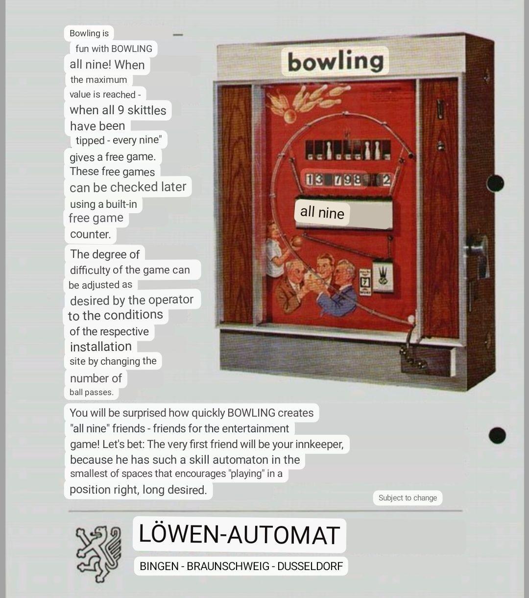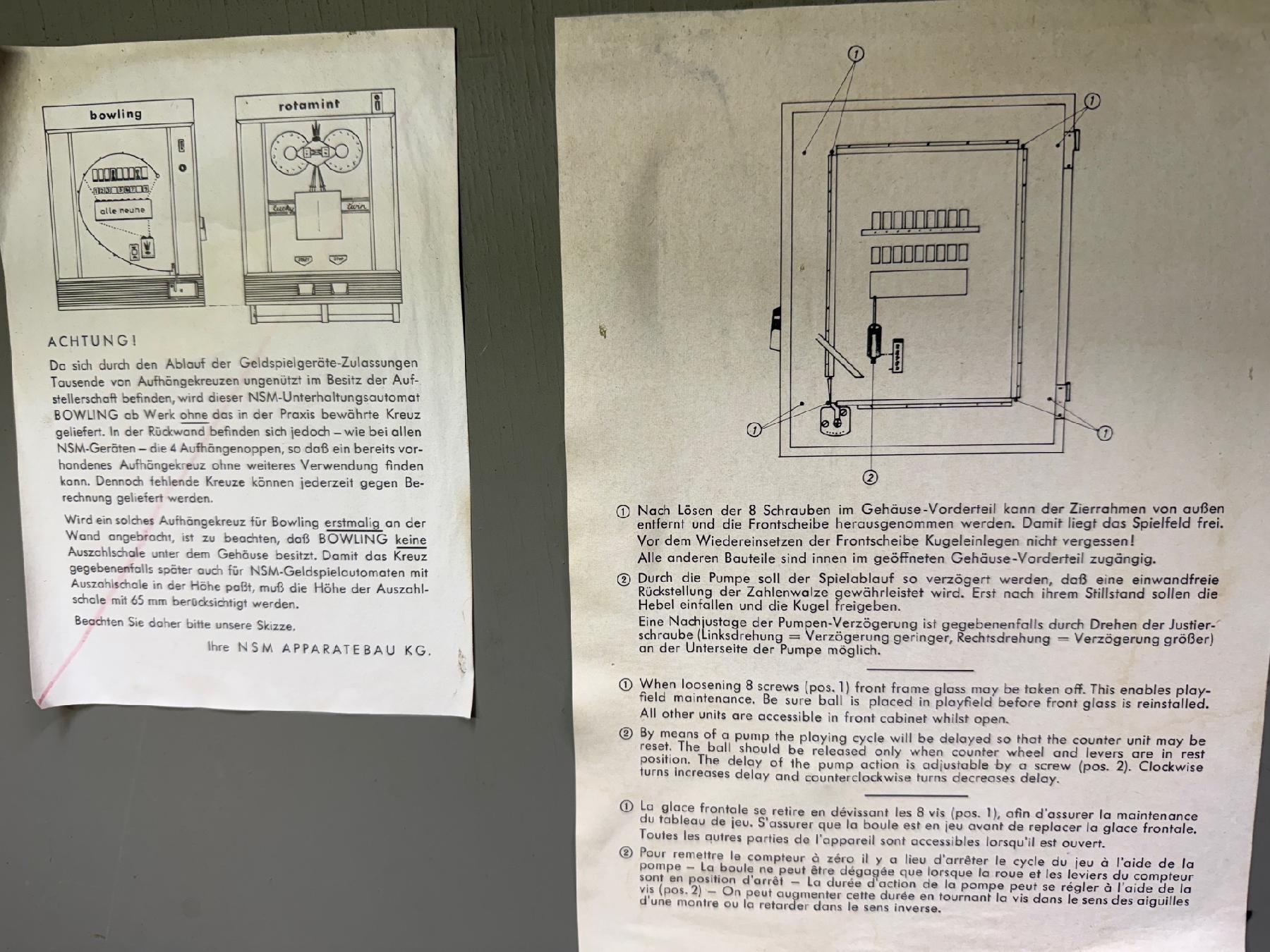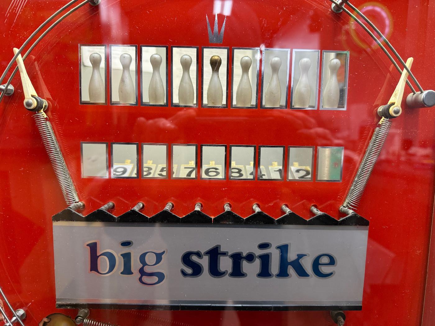 Description: Big Strike bowling, NSM (West Germany), 1969. Big Strike was sold by NSM of West Germany and has a couple different names and graphic formats such as "alle neune" ("all nine" or "all strikes" in English), due to its sale in both North American and Europe. On the North American sold games, a round sticker is covering the beer steins on the lower left playfield. This sticker says "bowling big strike", and looks like a bowling ball. Perhaps guys drinking beer isn't a great thing to celebrate in North American, hence the sticker covering the beer steins. Big Strike is a fully mechanical game, with the only power being for the top fluorescent display light. North American versions work on a dime. After inserting money, and reset lever on the side of the game puts all the bowling pins in visible view. Then the player uses a spring loaded plunger shooting a ball to knock down each of the 9 pins. As the ball falls through a drain area, it mechanically de-advances a ball count reel. When the reel reaches zero, the ball will no longer fall through to the plunger, and the game ends. The operator can select from 8 to 16 ball plunges by changing a small bolt position on the score reel. To get a final score, the player must add up their downed pin values to get the final score (much like a 1933-1935 prewar pinball machine!) The pin values can vary. But the most common seen is the center gold tip head pin is worth "9". But again this varies. It seems like the far left is hardest to score, and some games this has the largest score value. But the most common point order left to right is "135798642". When all the pins are downed, the words "play again" are spelled out by the downed pins, because the player has won a replay. If all pins are downed in a game, a mechanical lever falls enough so pulling the lever on the side of the game starts a new free game. Note if you want to print new score numbers I created a Photoshop document with them here. The game can be easily wall mounted using an NSM jukebox metal I bracket, and this is the most commonly seen way the game is played. But it also was available with a blue metal floor stand.