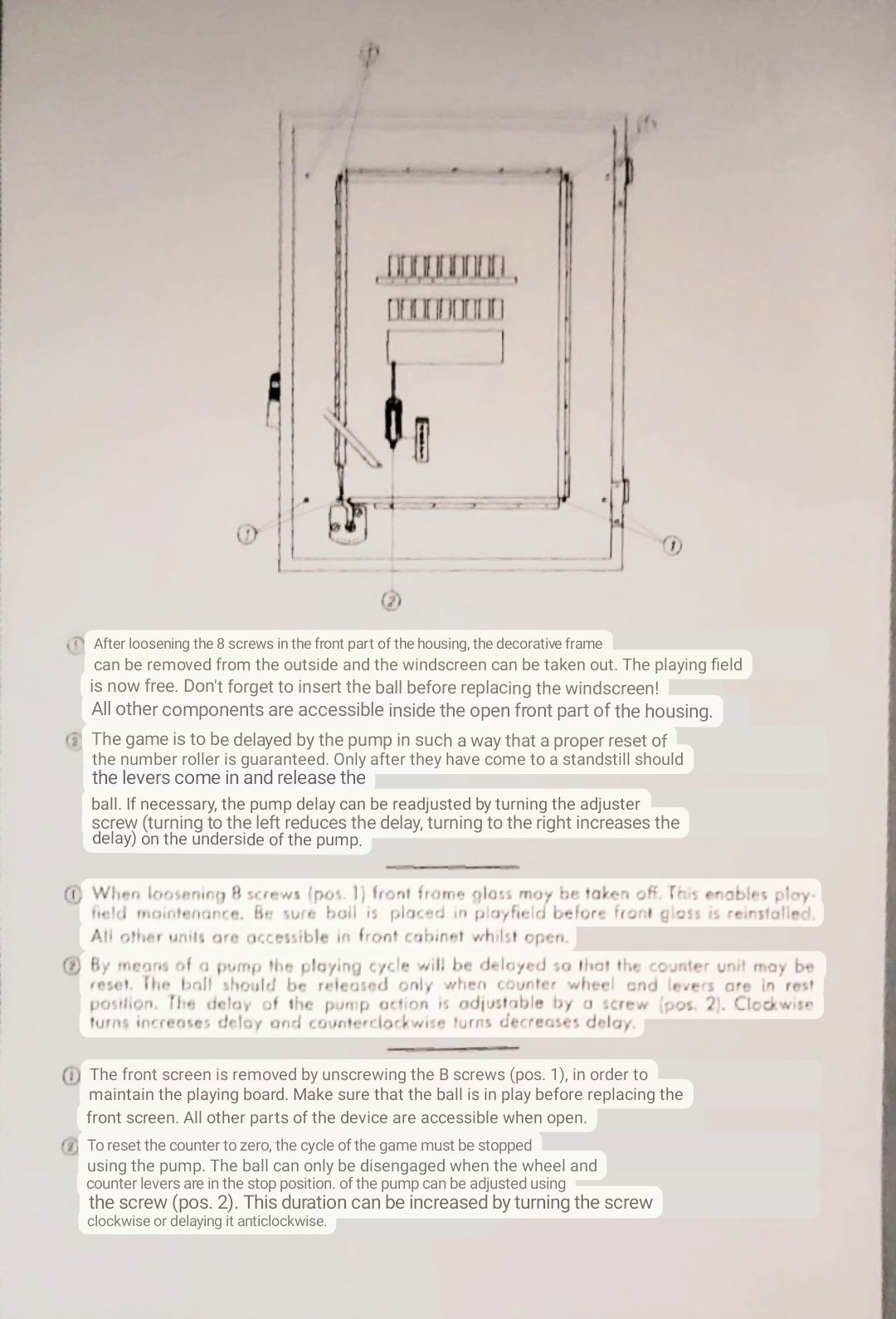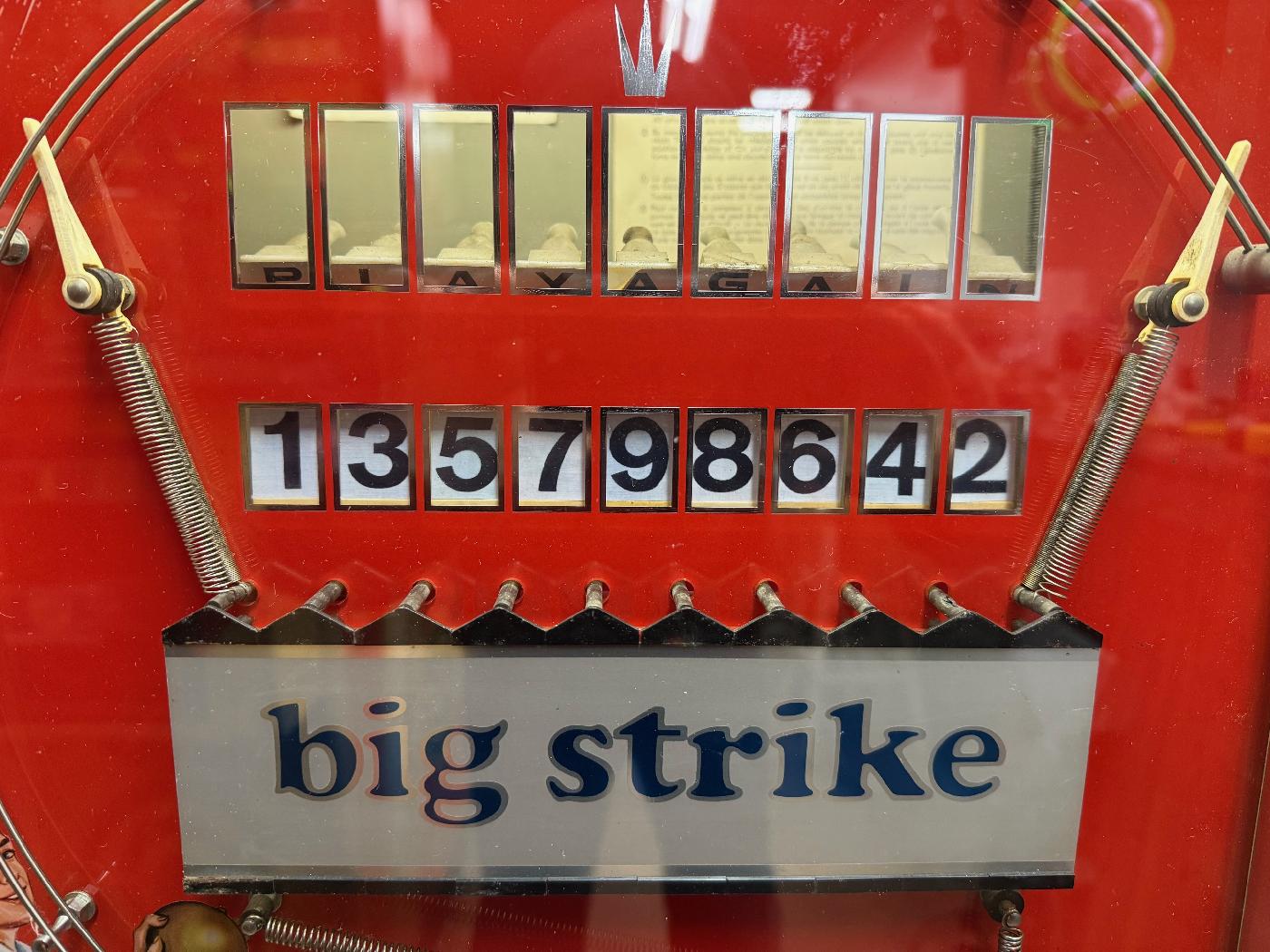 these parts: Another issue I have seen is the pins themselves. There is a small piece of L-shaped lead inside the bottom of each pin, which is a counter weight. If this is missing, the pins will not stay up when the game is reset. Luckily a new L lead weight can easily be fabricated by using a lead fishing weight, pounded into shape, to replace the missing piece. Hopefully no pins are missing on your game, as they are fragile and can break. Though I'm sure someone could 3d draw a new pin and 3d print it... Note the springs used on the ball count reel are very important. If missing, it is nearly impossible to find replacements with the same spring weight. This is another challenge when repairing this game. Everything is very "balanced" as the game is fully mechanical, and the weight of the ball must be able to trip the pins and move the ball count reel. This depends on the springs involved being the proper size/strength. Here is the manual for the game in PDF format: bigstrike_manual.pdf If you have an NSM Big Strike game for sale please contact me at cfh@provide.net