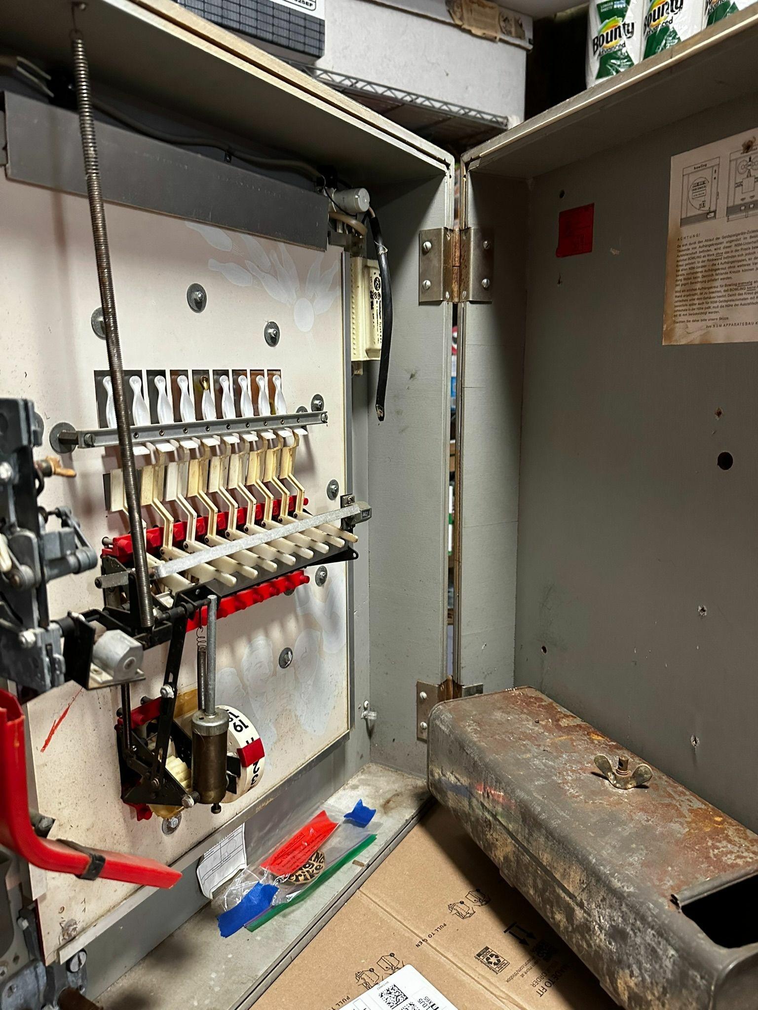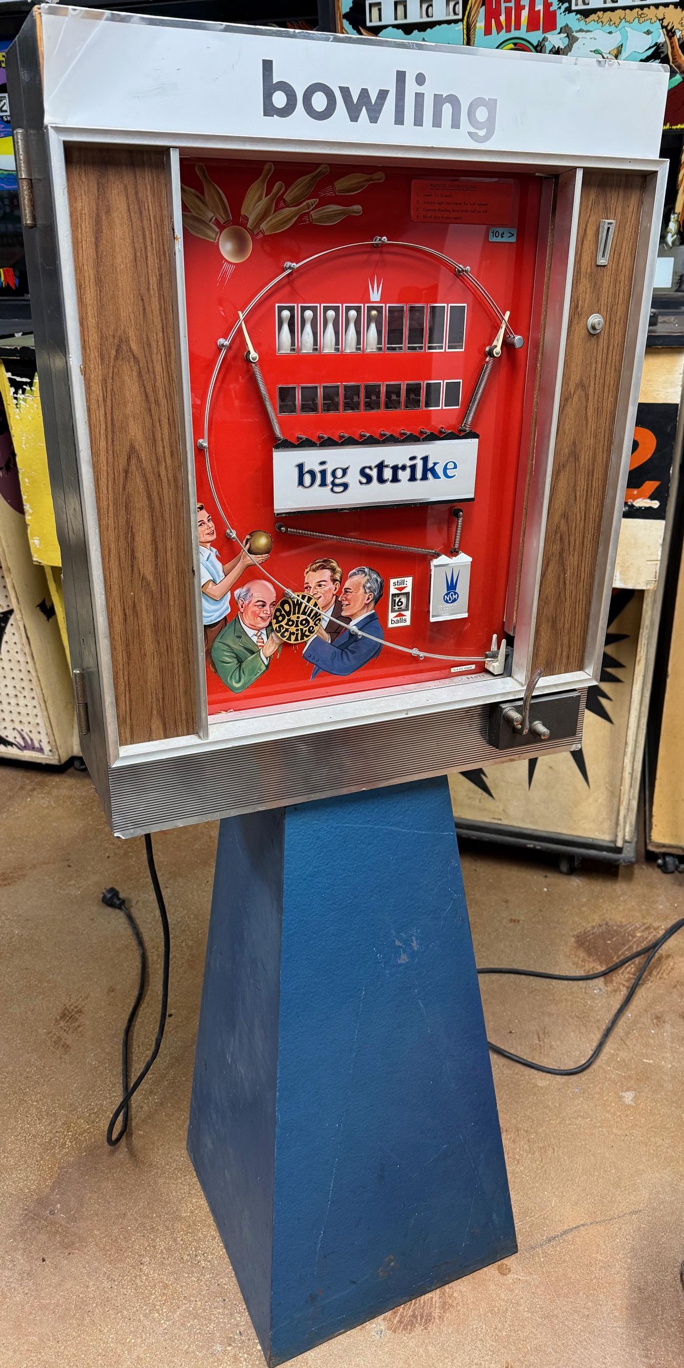 Description: Big Strike bowling, NSM (Germany), 1969. Big Strike was sold by NSM of Germany and has a couple different names and graphic formats, due to its sale in both North American and Europe. It is a fully mechanical game, with the only power being for the display light. North American versions work on a dime. After inserting money, and reset lever on the side of the game puts all the bowling pins in visible view. Then the player uses a spring loaded plunger to knock down each of the 10 pins. As the ball falls through a drain area, it mechanically de-advances a score reel. When the reel reaches zero, the ball will no longer fall through to the plunger, and the game ends. The operator can select from 10 to 19 ball plunges by changing a small bolt on the score reel. The game could be easily wall mounted, and this is the most commonly seen way the game is played. But it also was available with a blue metal stand.