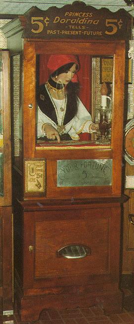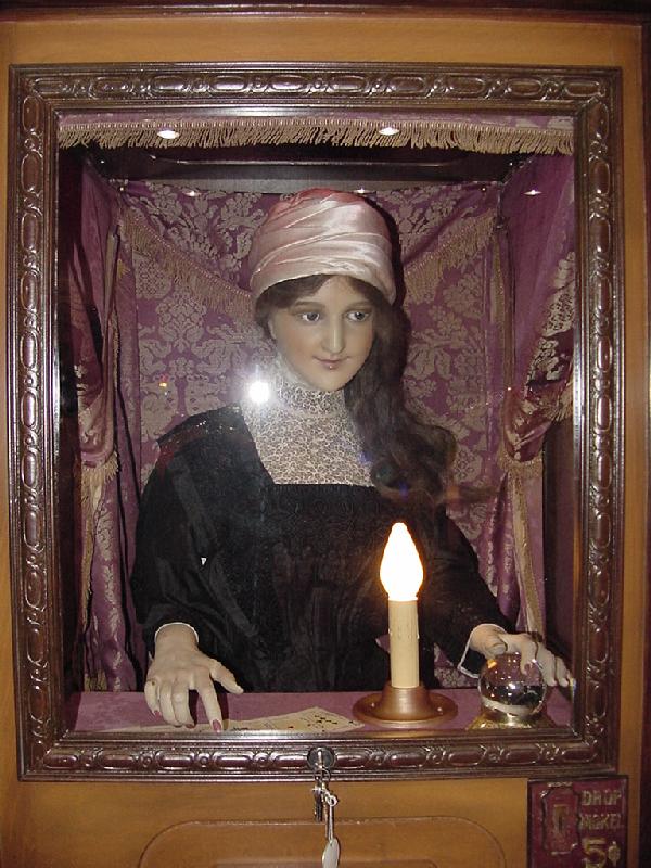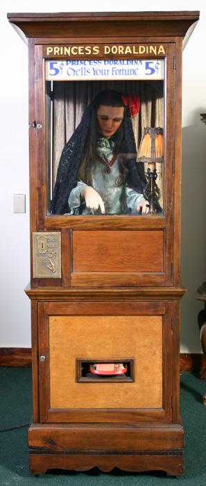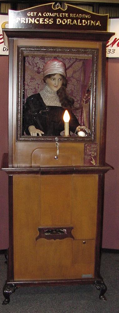 Description: Princess Doraldina fortune teller, Doraldina Corporation (Rochester NY), 1928, her chest moves as she breathes, and her eyes roll as she delivers a fortune. If you have a Princess Doraldina fortune teller for sale please contact me at cfh@provide.net