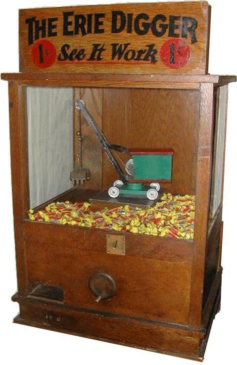 Description: Text and picture by J Roller. Erie Diggers were a favorite of the early traveling operators and remained so up to, and even well past, the Johnson Interstate Transportation Act of 1951. Most of the original cabinets were used and abused in years of carnival service, and when the machine parts wore out they were very often crudely hand-crafted by the carnival operators who owned them. Then, Lee Moss and Tommy Wells purchased the remains of the Erie Manufacturing Corp. in 1946 meaning that from that time forward parts were no longer available. The final destruction of most originals came with a mass re-modification by digger owner/operators following the Johnson Act. Lee Moss lead a small group of digger operators in a lobbying campaign which was successful in changing the classification of Erie Diggers from "Gambling Devices" to "Amusement Devices" in 1953, but they could no longer be coin-operated. The operators who owned Erie diggers were frantic to get back into operation and they immediately began scraping the coin entries, the intricate mechanical coin mechanisms, and ripping-off the cabinet backs. They cut-out parts of the cabinet tops in order to reach into the play area and control the merchandise. Some operators even blocked-off the prize chutes thinking to make the game more 'legit', and some operators whose cabinets were already in sad condition just threw them on the burn pile and built new cabinets of their own design, often in multiples to mount on trailer concessions.
