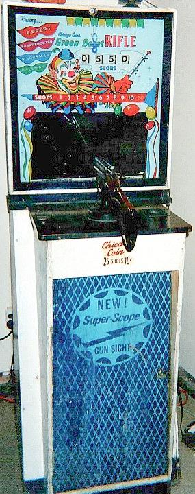 Description: Green Beret, Chicago Coin, 1966 or 1967. Nearly identical to CCM's Super Scope. As Brian Amyotte explains, the arcade game manufacturers sometimes titled their games after popular songs and movies. There was a song called Green Beret by Sgt Barry Sadler that was #1 for 5 weeks in 1966 and the #21 song of the 60's. This is the game as Super Scope except the the words "Green Beret" on the backglass read "Super Scope". Not sure why anyone would title a clown themed game Green Beret. The Super Scope refers to the tube mounted on the rifle as a gun sight. The targets included a swinging target, spinning targets when hit and targets that dropped out of sight when hit. There are additional targets that are silkscreened onto the back of a one way mirror that would be visable once the interior blacklight was turned off and their small lights lit to illuminate them. These targets were a Bear, Swan, Duck and a Rabbit. In the center was a large bullseye with sequencing lights that varied the score value. This is a novelty game and tough to setup accurately since everyone sees the scope slightly different.