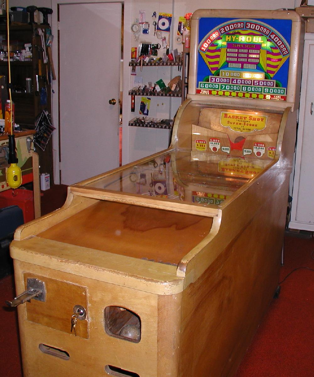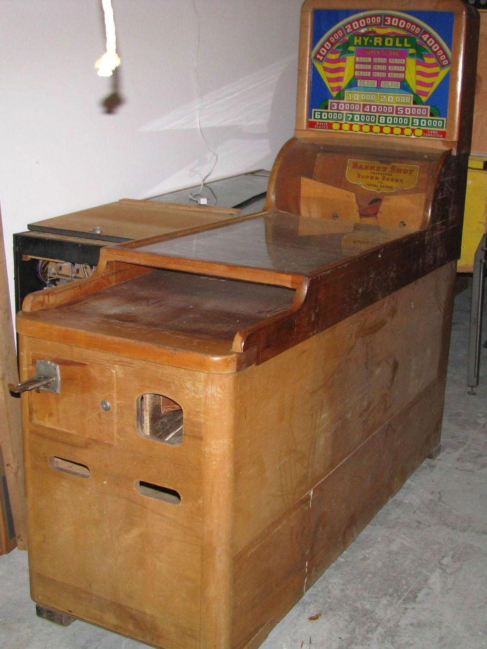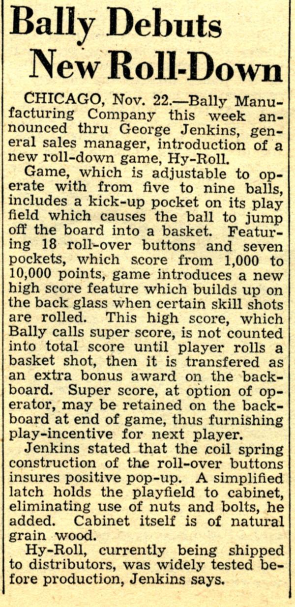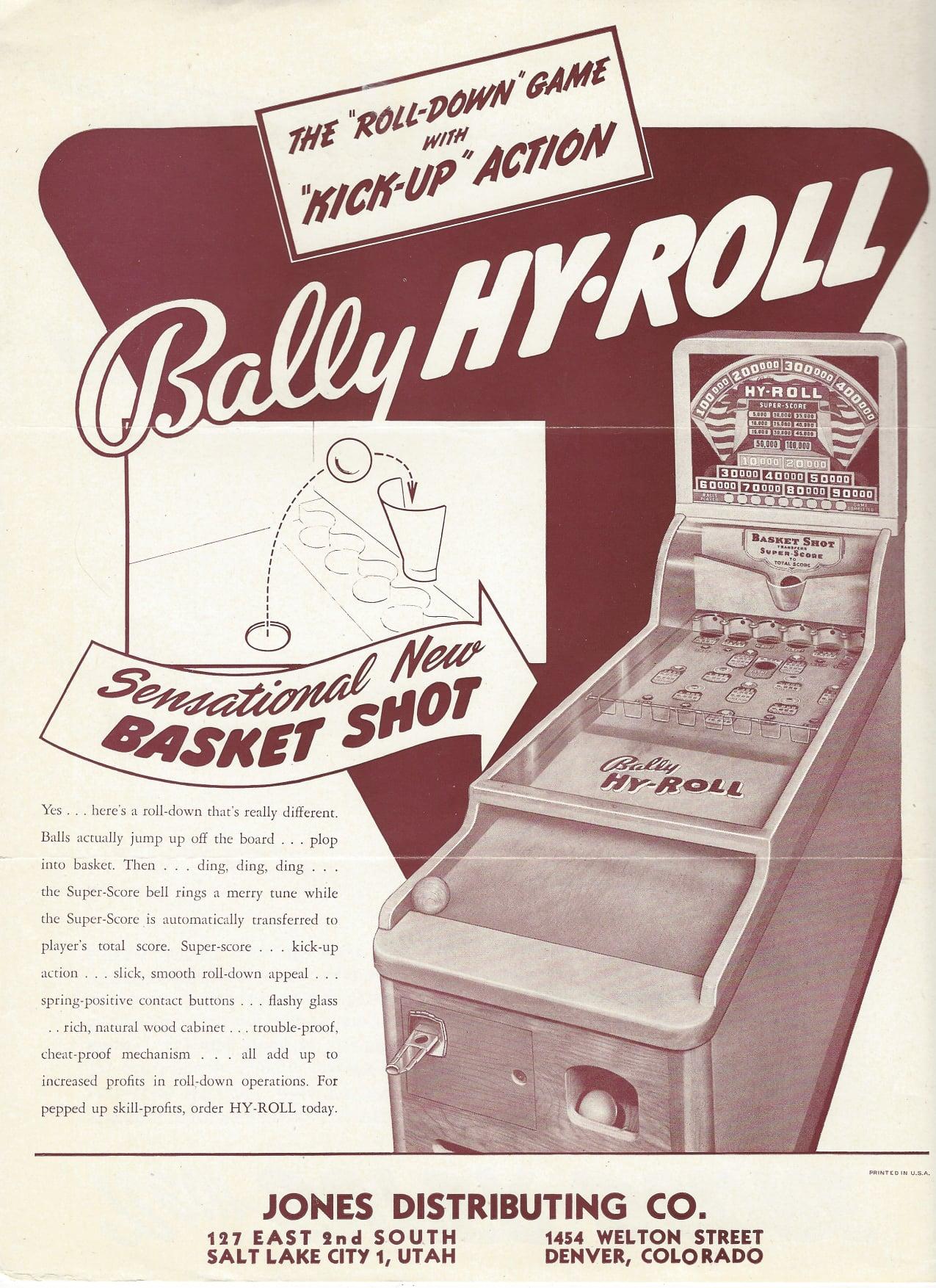 Description: HyRoll, Bally, 11/47, rolldown game. Has 18 roll over buttons and seven pockets which score from 1000 to 10,000 points. One pocket is a kickup, that shoots the ball into the back trough (kind of a vertical up kicker). The 'super score' is a carry over feature that maintains from game to game. Adjustable from 5 to 9 balls per game. aka Bally Hi-Roll Hy-Roll. If you have a Bally High Roll Hy-roll for sale please contact me at cfh@provide.net
