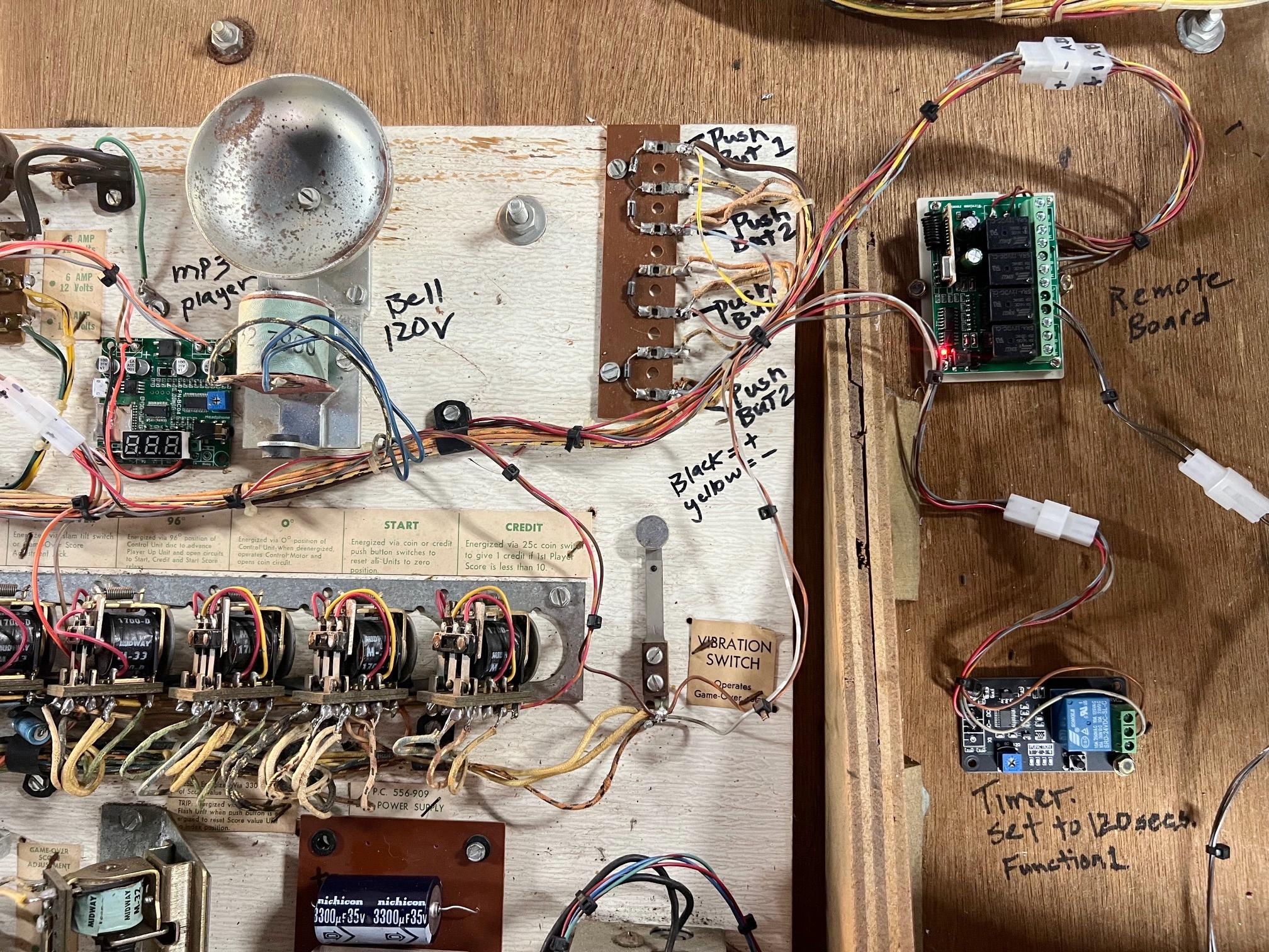 Adding a Timer. I bought a timer board off Ebay for less than $10 and found it works quite well. It powers at 12 volts (like the MP3 and Remote boards.) For the timer board use the power stream that the MP3 board is using (the Lock relay power.) This way, the timer board turns on right when a game is started, and counts down. After the set time, it Slam tilts the games, turning off power to the timer board (and the MP3 player, if you are using that), and of course ends the current game. I tried a couple different timer boards, and they both worked well. One was set to two minutes maximum, which is probably a bit short. The other was more programmable and had a nifty countdown LED, so went with 180 seconds on that board. Then after the set time (be it two or three minutes), or players get to 50 points (which would end the game anyway), the game automatically ends. The timer relay's Normally Open switch is connected to the Vibration Slam switch. After 120 or 180 seconds, the timer board's Normally Open relay switch closes and slam tilts the Vibration switch, which ends the game. It works really well! I have found that two minutes is a bit short, but that's plenty of time for two half drunk players to get through a game. Now admittedly, if they only get 2 points each for *every* shot, their game is more like four mintues. Hence I used the other timer board with the LED countdown, and set it to a three minute game. This timer addition is a great way to avoid risk for 50+ year old motors. Because someone starts a game and walks away, these Midway games can self destruct.