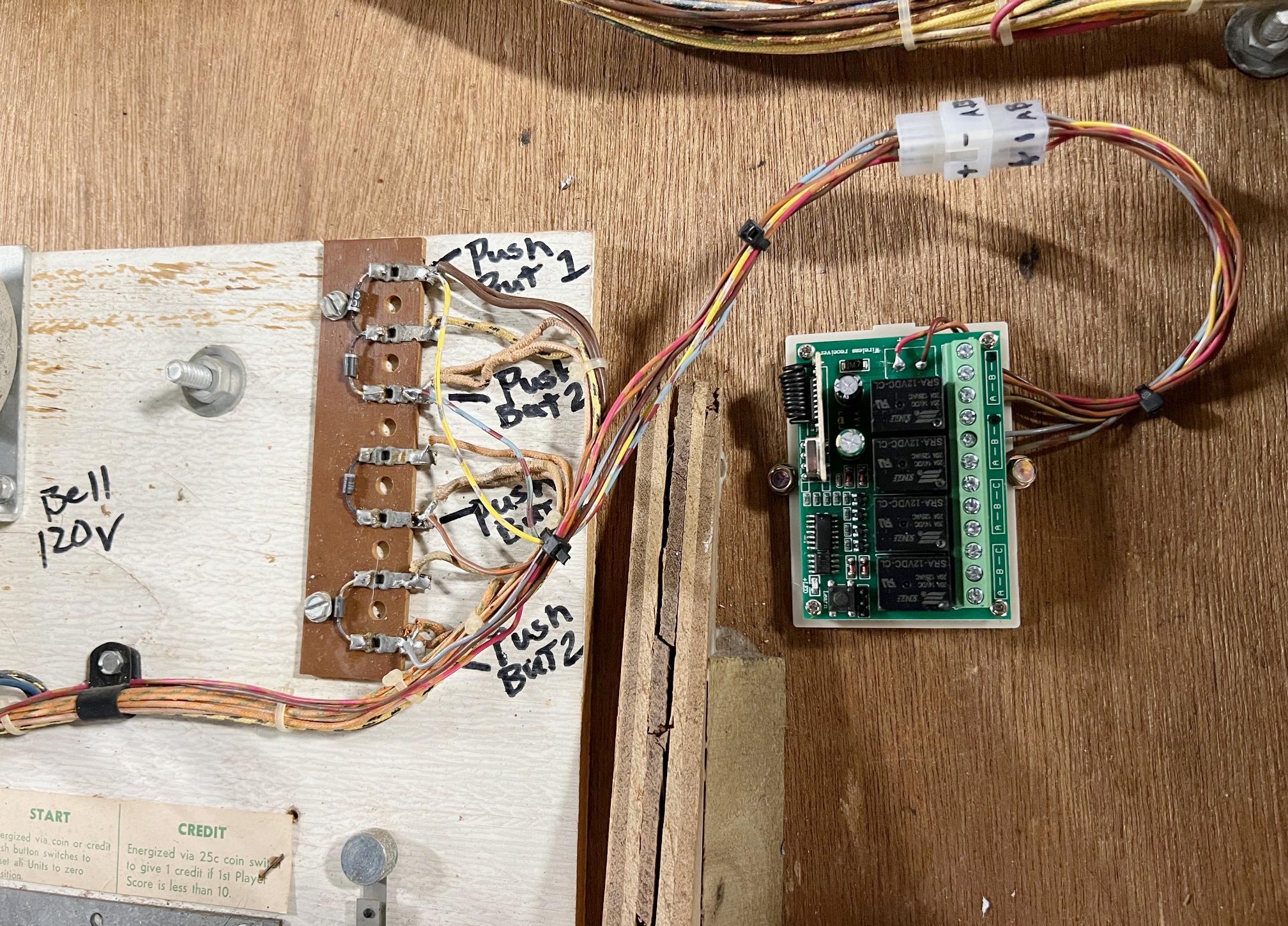 Replacing the Remote Controls. Amazon sells 12 volt Relay Wireless RF Remote Control Module with two 433Mhz Transmitter key fobs here. With some wiring this can be used, and it works well. There's a small 3 pin jumper on the remote receiver board - remove that and discard. Then wire the "A" N.O. relay switch for player1, and the "B" N.O. relay switch for player2 in the game (I used the diode terminal strip in the game, it's easy to tap into the player controls there.) The 12 volt power can be gotten from the Lock relay power (same power source used for the MP3 player mod.) The remote boxes can also be purchased on Amazon here. Drill a hole for a momentary switch in the face of the box. Take the remotes apart, remove the metal button film from the remote circuit board, Then solder two wires to the "A" contacts (for player1), and the "B" contacts (for player2.) Mount the remote boards in their respective boxes and you now have two new player remote controls for the game. I have also created some Photoshop graphics for the Golf Champ box here. There is one other option which can be deployed with this remote: have the game start function on one of the remotes. There are four relays on the remote receiver board, and we are already using two of them for the player 1&2 functions. Hence using the "C" relay and its N.O. contacts, you could start a game wireless on the remote. Of course you'll have to add another momentary switch to one of the remotes... The problem with this is the remote receiver board's power has to be on all the time. So using the Lock relay power setup (as used with the MP3 board) will not work. Instead you'll need to power the remote board with the Black wire (+12v) and the Yellow wire (-12v.) On Golf Champ the slam switch has the yellow wire, and the black wire is pretty much the power wire to nearly all relays (I used the Credit relay's black wire, as it's closest to the slam switch.) This will power the remote receiver board as soon as the game is turned on. Additionally two wires can be connected from the remote receiver board's N.O. "C" relay terminal switch A&B, to the start button. This of course assumes you have a press button on one of the remotes connected to the "C" button terminals. With this the game will start up using the remote. If you do this, I would recommend having the game on Free Play (see above.) The big issue with having a remote start button comes during game play... a user could accidentally (or purposely) press the game start button in the middle of a game, and restart the game. For that reason it may be prefered to have the start game function separate from the handheld remotes.