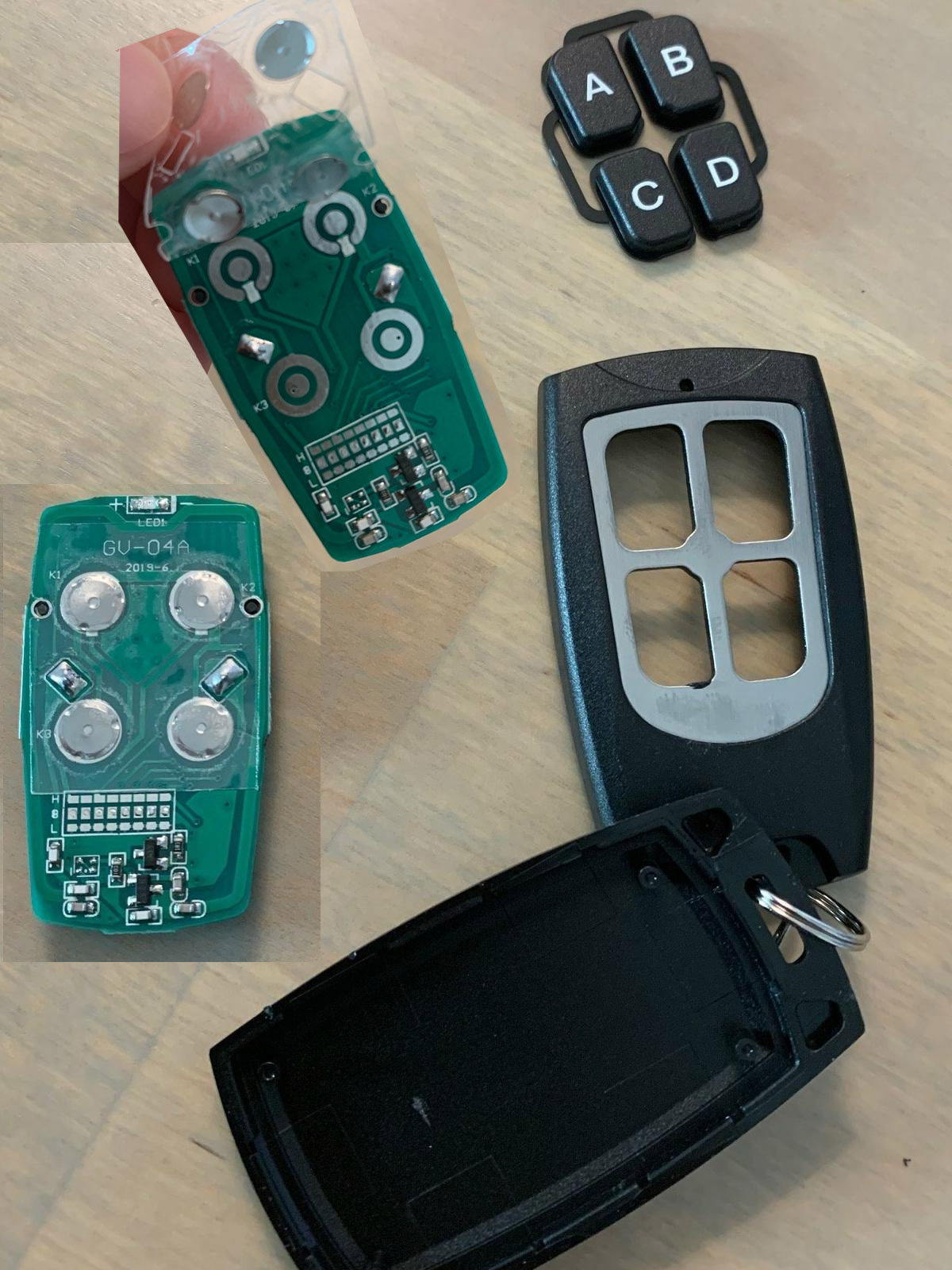 Amazon remote key fobs taken apart. The clear tape with the metal slugs needs to be remoted,