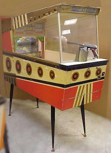 Description: Shooting Gallery Midway, 9/60, shoots real 11/16" plastic balls using a vacum/compressor system, individual targets that fold back when hit, back and forth moving targets. This game came in both scoreglass scoring (no score reels) and score reel scoring. Very similar game to the other projectile gun games like Midways's Deluxe Shooting Gallery (3/61), and Bally's Sharp Shooter (1/61) and Marksman (6/61), and Midway's White Lighting (9/70). Please contact me if you have this game for sale at cfh@provide.net