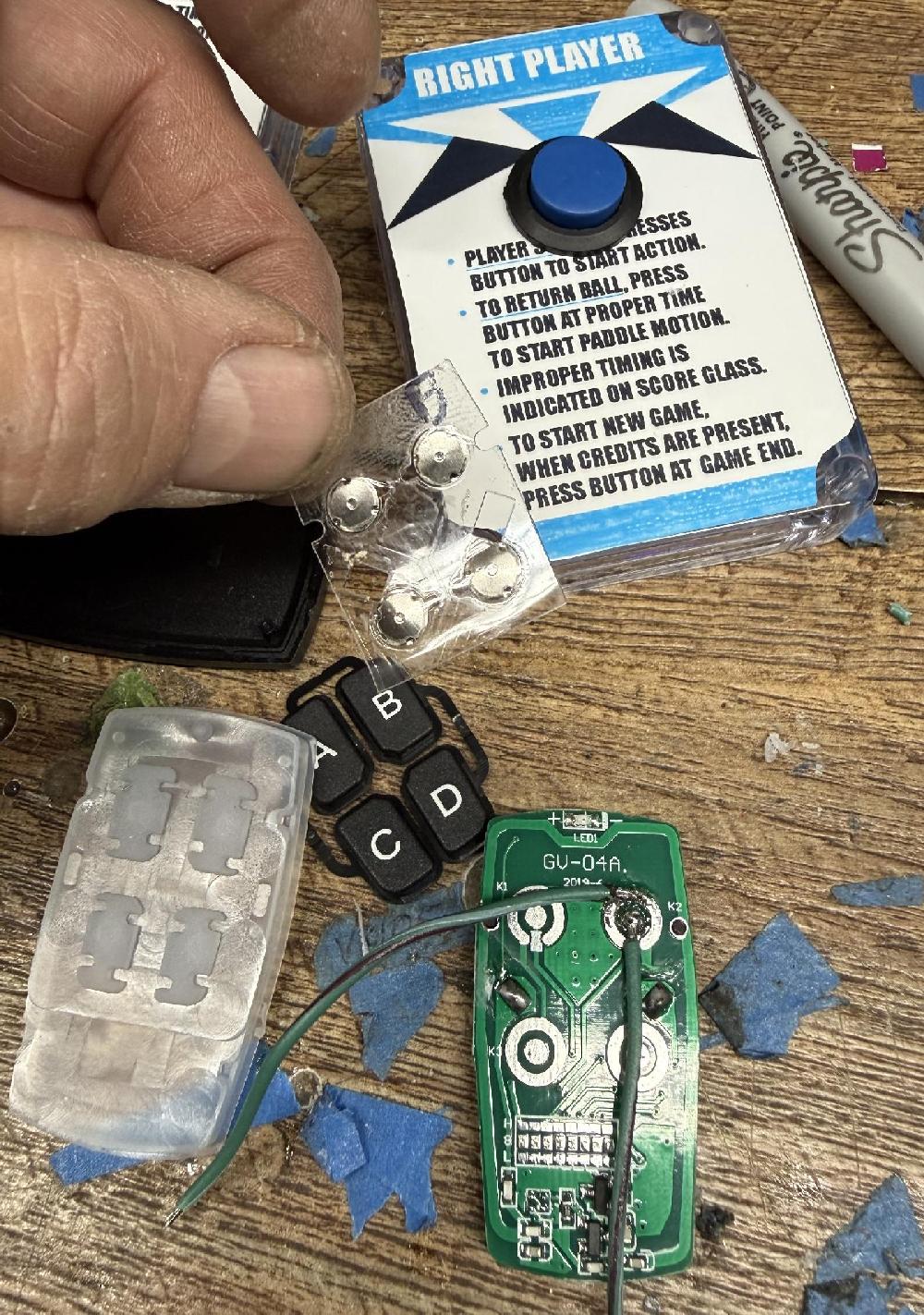 Replacing the Remote Controls. Amazon sells 12 volt Relay Wireless RF Remote Control Module with two 433Mhz Transmitter key fobs. With some wiring this can be used, and it works well. The original remote receiver board can be removed. Note these new remote boards have four relays, but for Table Tennis, you only need the A and B relays. Train the keyfobs to your new receiver board (instructions included with the remote board.) Then connect the new receiver relay board's ground supply to the middle relay lug of the A and B relays. A seperate wire is then connected to each of the Normally Open A and B relay contacts. All this wiring (four wires) is connected to the existing original Table Tennis receiver board connector. I soldered the new remote wires to the back of the original receiver board. If you do this, should cut to the two 12v power jumpers on the face of the original receiver board, since you do not want any confusion between the two (possibly competing) receiver boards (new and orginal.) Also I routed the original purple antenna wire through the small coiled antenna wire on the new receiver relay board. This really seemed to help with keyfob reception! For the wiring of the new receiver relay board, I used the original connector going to the original receiver board. It was just easier to tap into the game this way. On the original receiver board connector, the center yellow wire pin5 is ground, the two outside black wires pins1/9 are +12 volts. The A relay (left player) wire goes to the left player black/yellow wire (pin6), and the B relay (right player) wire goes to the right player red/white wire (pin4). Now when the game is played, the keyfobs are the players' triggers. You can mount them is a larger box, which is a nice touch (see below), because playing this game with a keyfob kinda sucks (and they are small enough to loose easily.) Remote boxes can also be purchased on Amazon. Drill a hole for a momentary switch in the face of the box (drill slowly, the boxes can crack if you drill too aggressively.) Take the remotes apart, remove the metal button film from the remote circuit board (it's taped in place), then solder two wires to the "A" contacts (for Left player), and the "B" contacts (for Right player.) Mount the remote boards in their respective boxes and you now have two new player remote controls for the game. I have also created some Photoshop graphics for the Table Tennis remote boxes. On this game (and only Table Tennis from what I have seen), the Left and Right player buttons *also* triggers a new game (assuming the game is over and there are credits, which if you did the free play mod, there are.) Hence if power to the remote receiver board is always on, pressing either the left or right tennis button will start a game. That's why I did not use the Lock relay power setup for the new remote board (which only provides power during game play.) But if you don't want that feature (that is you want to force the players to press a 'start' button), wire the remote board to the Lock relay power (instead of using the original receiver board yellow/black wires for power.)