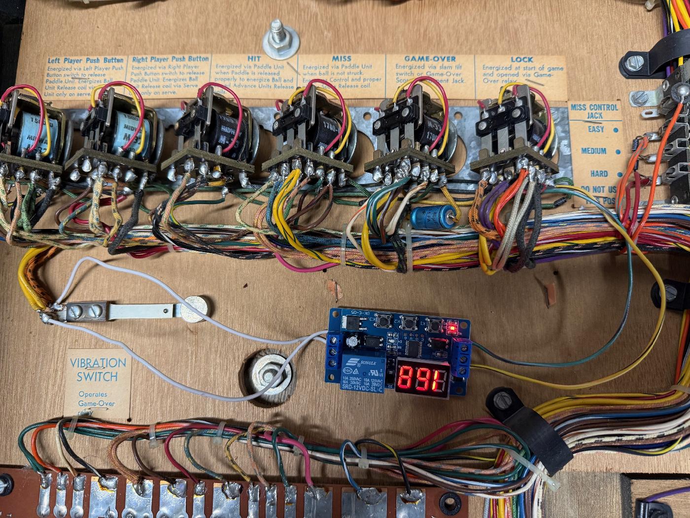 Adding a Timer. I bought a Timer Board on Amazon for less than $10 and found it works quite well. It powers at 12 volts (or 4vdc to 20vdc.) The timer board use the power stream from the Lock relay power. This way, the timer board turns on right when a game is started, and counts down. After the set time, it Slam tilts the games, turning off power to the timer board, and of course ends the current game. I tried a couple different timer boards, and the one i liked best was more programmable and had a nifty countdown LED. This way could program the board to 180 seconds. Then after this set time, or to the specified number of points to win (Midway Table Tennis selectible from 4 to 8 points), the game ends. The timer relay's Normally Open switch is connected to the Vibration Slam switch. After 180 seconds, the timer board's Normally Open relay switch closes and slam tilts the Vibration switch, which ends the game. This works really well. The COM and CK leads of the relay are just connected to the slam switch lugs. And the VCC goes to the Lock relay's banded diode lug (12v), and GND to the Lock relay's non-banded diode lug. I have found that two minutes is a bit short, and set it to a three minute game. This timer addition is a great way to avoid risk for 50+ year old motors. Because someone starts a game and walks away, these Midway games can self destruct. And repairing/replacing those motorized score reel motor(s) is a job that no one should want to do.