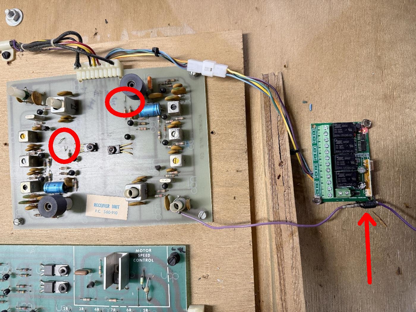 The red arrow shows the new receiver board's antenna. I routed the original purple antenna wire