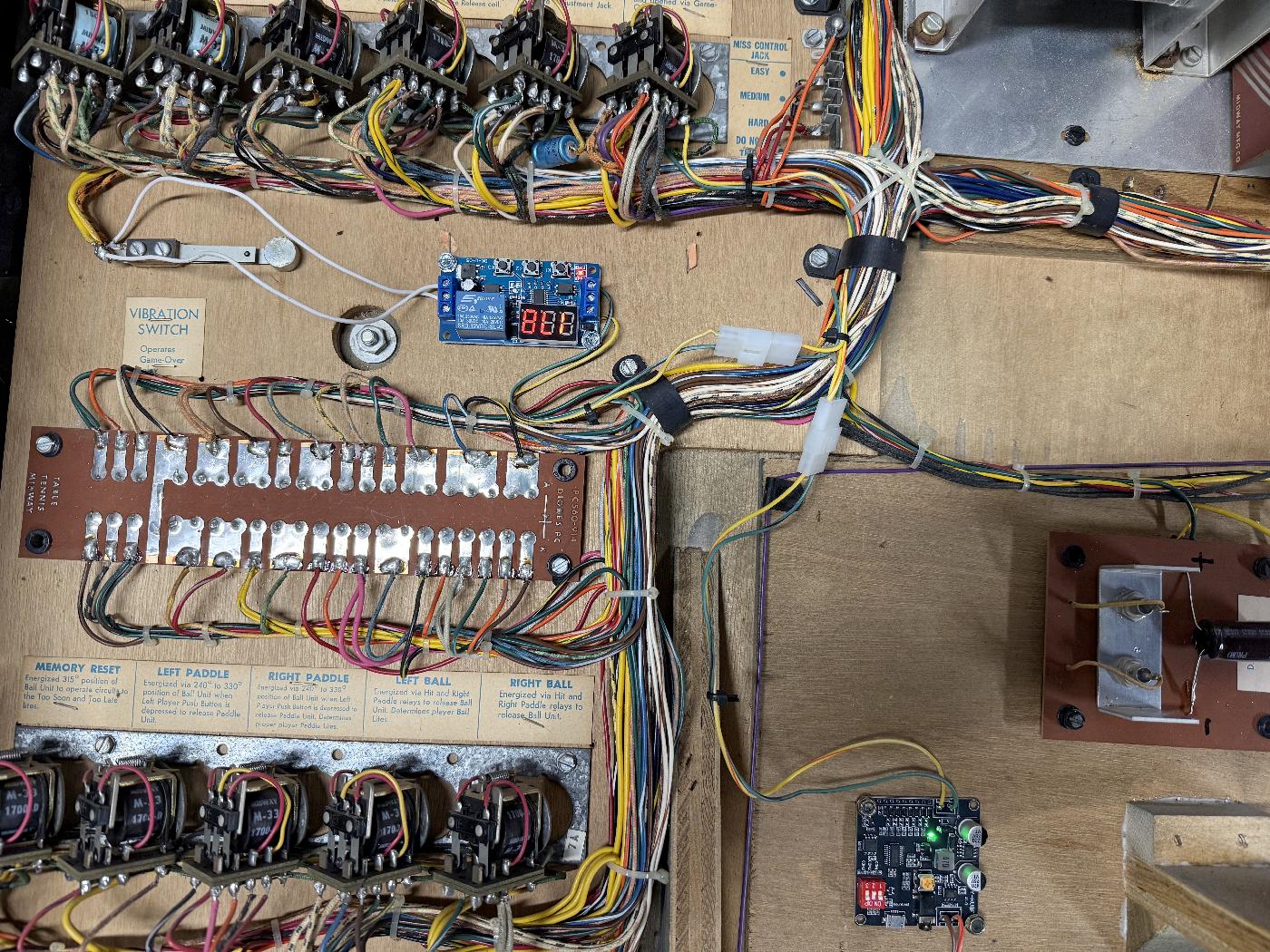 Midway Table Tennis showing installed MP3 player and Timer board (at 178 seconds.) Vibration switch is connected
