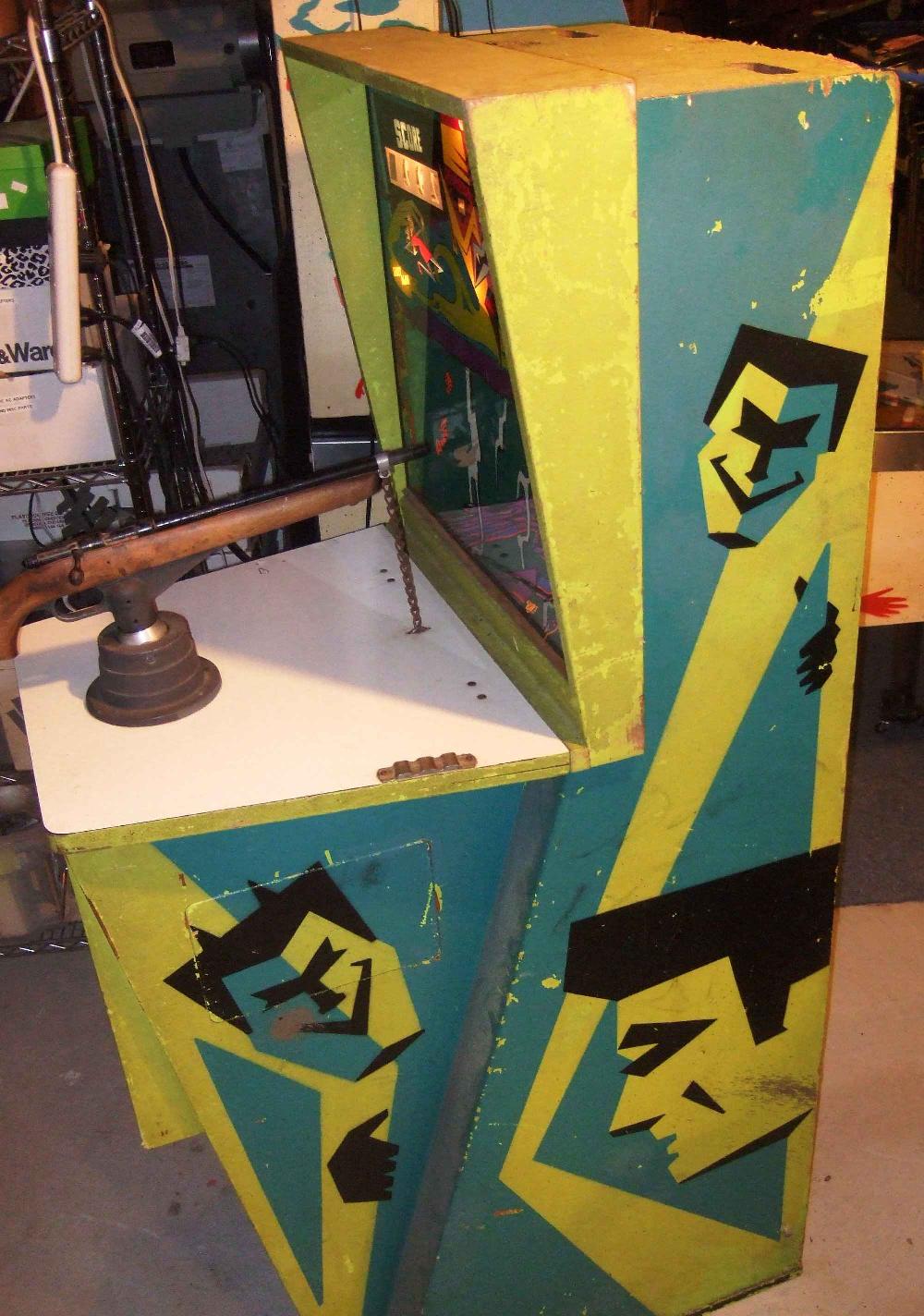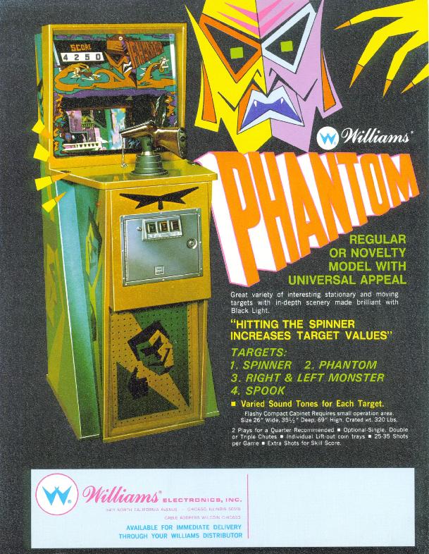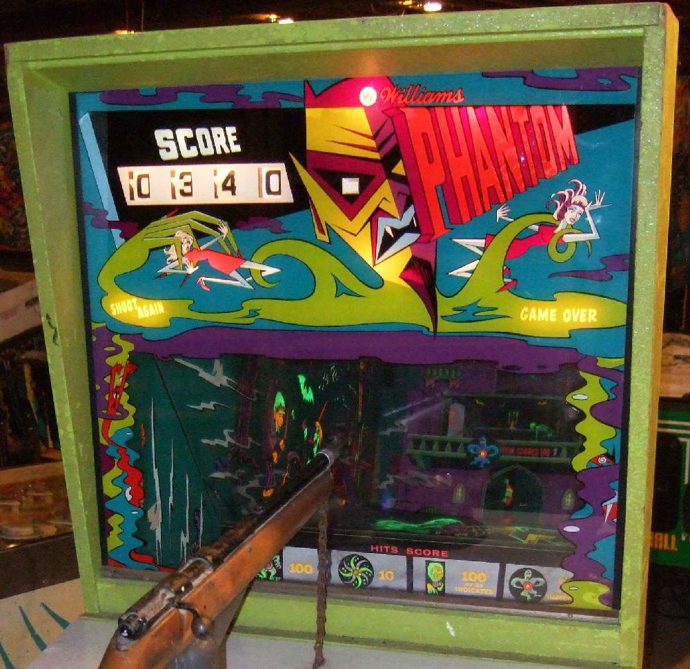 Description: Phantom Gun, Williams, 8/69, game #375, electronic sound. Adjustable for 25 or 35 shots per game. Essentially the same game as the prior 1969 Williams Spooks, but in a different (number of shots) format. Last Williams gun game with replay button on left side of cabinet. If you have a Williams Phantom gun game for sale, please contact me at cfh@provide.net