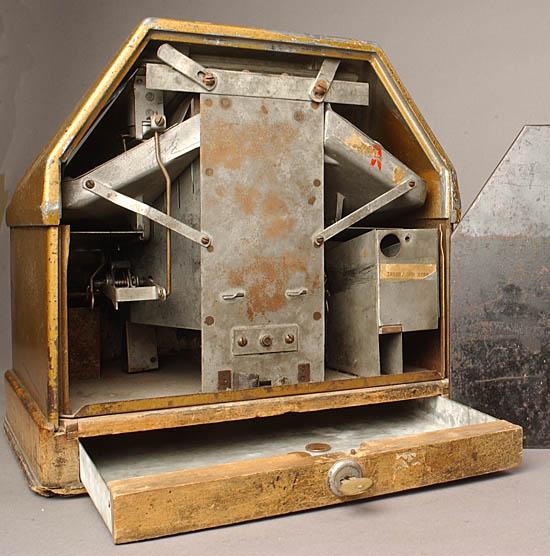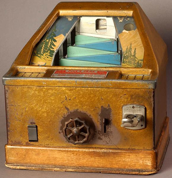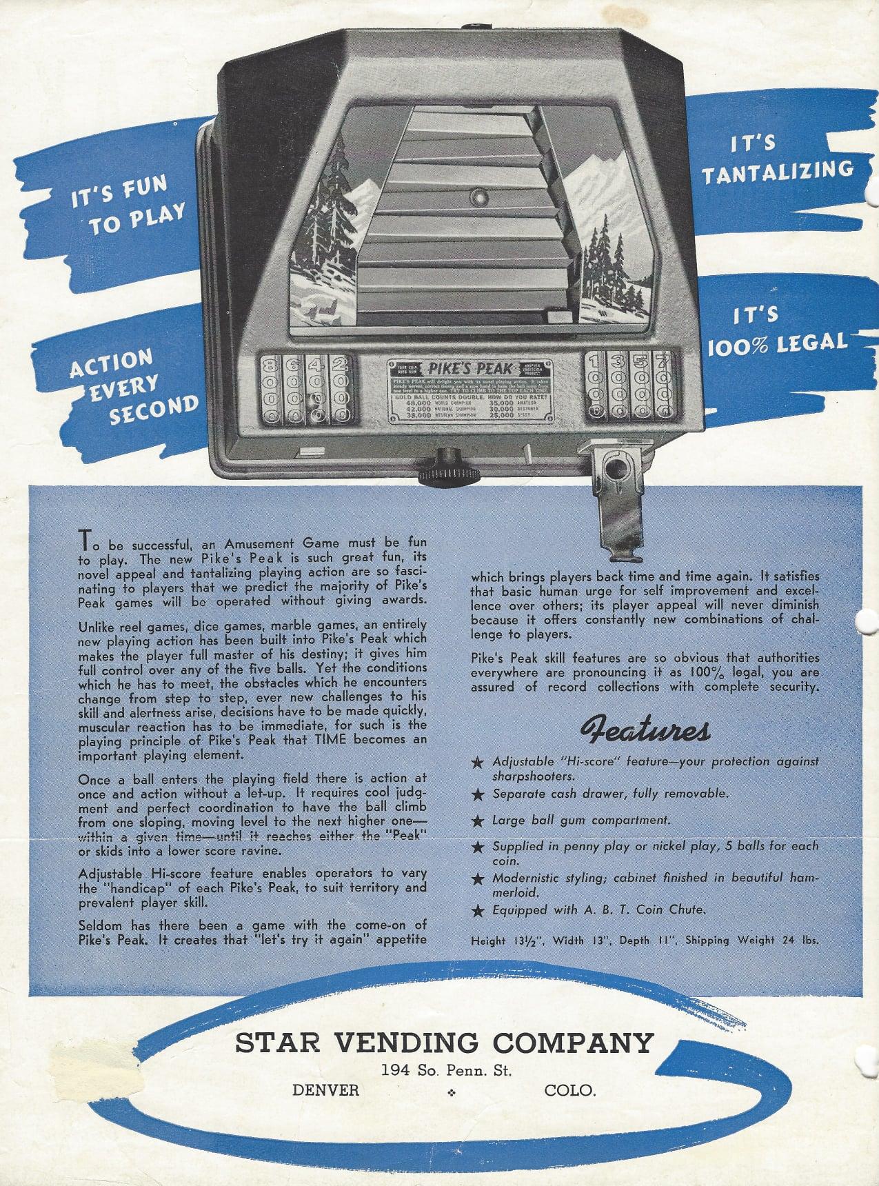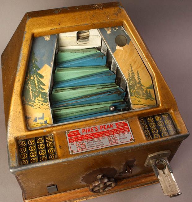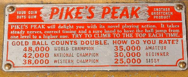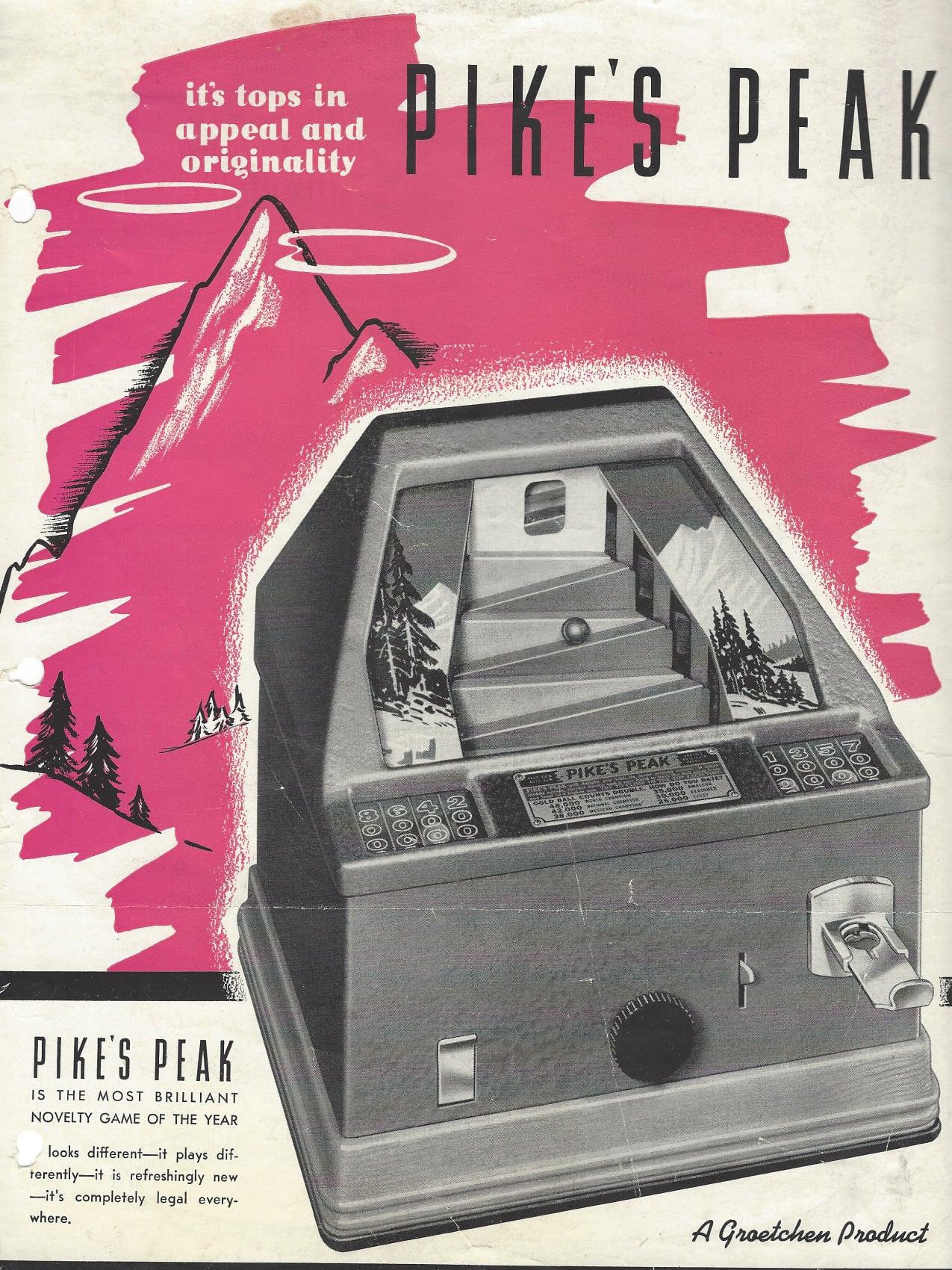 Description: Pike's Peak, Grostchen, 1939, a mechanical arcade game/trade simulator that dispenses gum balls, try and get the metal ball to the top of Pikes peak. if you have a Grostchen Pikes Peak for sale please contact me at cfh@provide.net