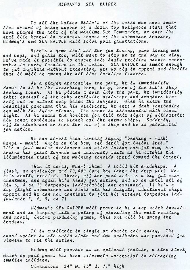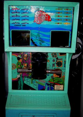 Description: Sea Raider, Midway #543, 7/69, electronic sound, a submarine game with the player looking through a periscope to shoot ships. Inspired by 1968 Sega EM game Periscope and Sea Devil (9/70) and Sea Wolf (1976). Sea Raider is 24" wide, 23" deep, 71" high (smaller than Sea Devil). If you have a Midway Sea Raider for sale please contact me at cfh@provide.net Interior scenery (available for download thanks to T.Iskander) inside the machine is lit up with a blacklight tube. As the game starts boats start cruising by across the back of the scenery, and the front glass lights up "torpedoes ready to fire". Look through the periscope and aim in front of the ship, then press the fire button on the right handle. An electronic "whoosh" sounds is made as the torpedo heads towards the boat. There are a series of ten torpedo shaped lights on the playfield that make the torpedo look like it's moving towards the ship (light animation). If the boat is hit the scenery flashes a 120 volt red light from each side and an explosion is heard. There is an electronic sound board that makes the sonor "beep" and the torpedo "woosh" sounds, and an amplifer circuit for these sounds. The explosion sound however is a mechanical sounds. It's made by pulling in a relay attached to a spring, with a magnet (to make the sound more robust) near a transducer. The spring vibrates and is read thru this phonograph needle/transducer device, like an old guitar reverb unit. A 500 mfd cap is added to the explosion relay to hold the relay in for about 2 seconds giving a longer explosion sound (if the explosion sound is too short, this cap is probably dead). This mechanical set up gives a nice explosion. A guy on ebay had a schematics of the sonar/amplifier/woosh sound boards here. The power supply for the sonar/woosh sound boards is unregulated 18 volt DC and comes from 12 volt AC to a single diode and capacitor. Adding capacitance can reduced sound hum, but will not eliminate is. It's just 1/2 wave DC regulation (not full wave like a bridge rectifier would provide), so there will always be a bit of hum. The machine tracks how many torpedoes have been fired and how much tonnage has been sunk. The goal is to sink as many boats as you can using your torpedoes. The game gives you ten torpedoes per play with bonus torpedoes awarded for a perfect score. The boats also may change direction at any time for more challenge. There are also two windows in the front top glass that allow other people to watch the action as you play. Scoring is done with light box scoring (no score reels). Sea Devil, which came out about ten months later, is basically the same game but more refined. For example the ships on Sea Raider are cardboard cutouts drawn with black outlines. On Sea Devil the ships have much more detail and use much more artwork. Also the cabinet on Sea Devil is more refined (and wider so the playing field is wider), but Sea Devil is essentially the same game. If you have a Midway Sea Raider game for sale please contact me at cfh@provide.net