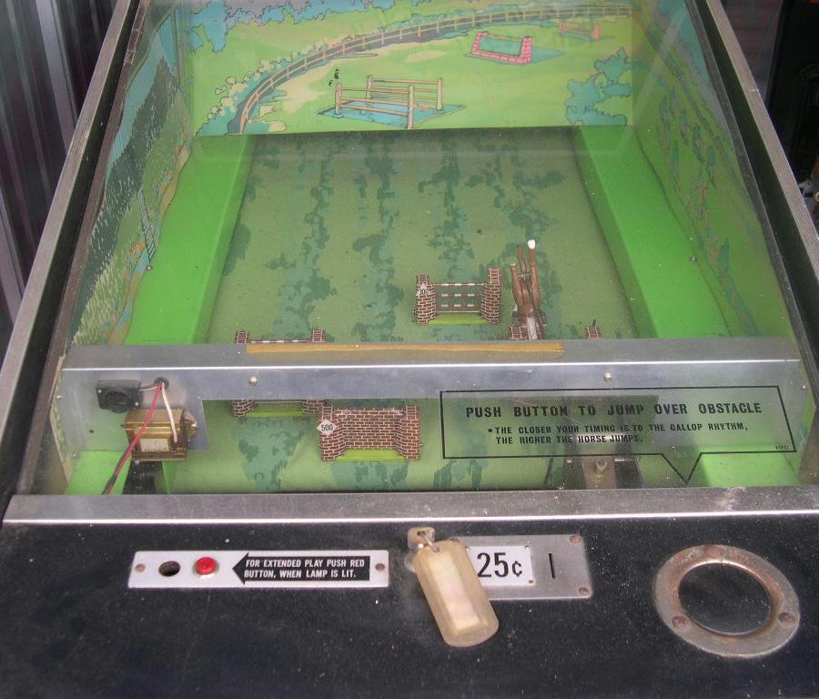 Description: Grand National Race, Sega, 1972. 8-track sound. Sega Grand National is a steeple chase horse racing game. Your horse gallops down the track (a continuous belt) and you have to time your jumps to clear the hurdles and obstacles on the track. Sound info thanks to Mark: Grand National uses an 8-track tape for sound effects. One channel has galloping sound effects and the other has the start-of-race bugle fanfare. Bugle sound, Horse sounds, both together. If you have this game for sale please contact me at cfh@provide.net