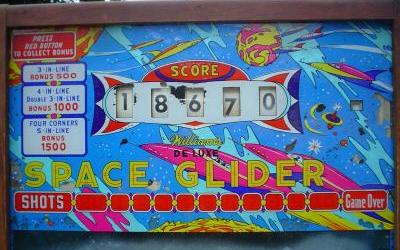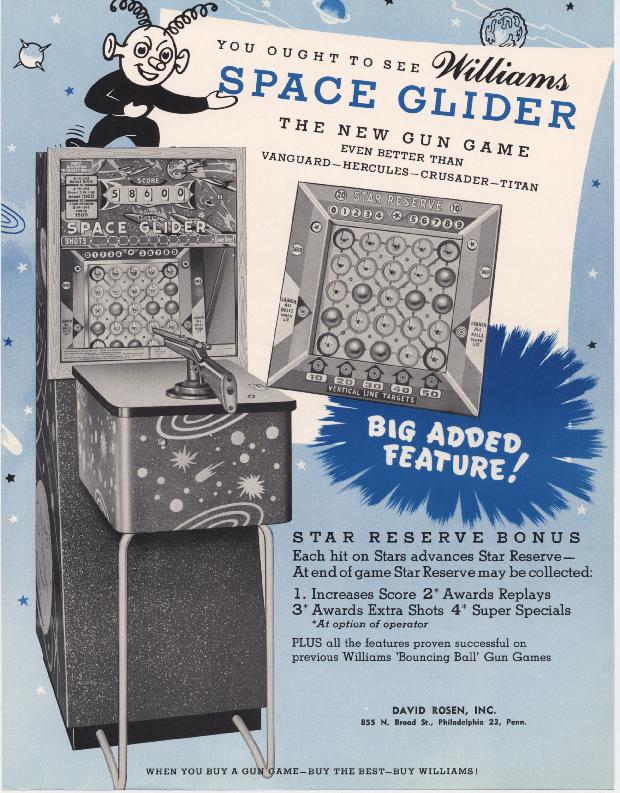 Description: Space Glider, Williams #243, 11/60, a gun game that pops rubber balls into the air completing bingo style patterns.