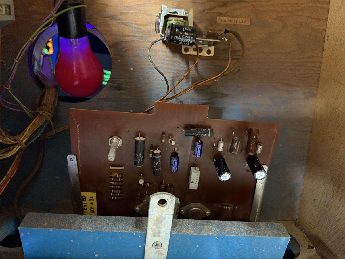 The sound board and sound relay ("Tone Delay Relay") used in Williams Spooks. The capacitor holds the relay in, for a longer Witch sound tone.