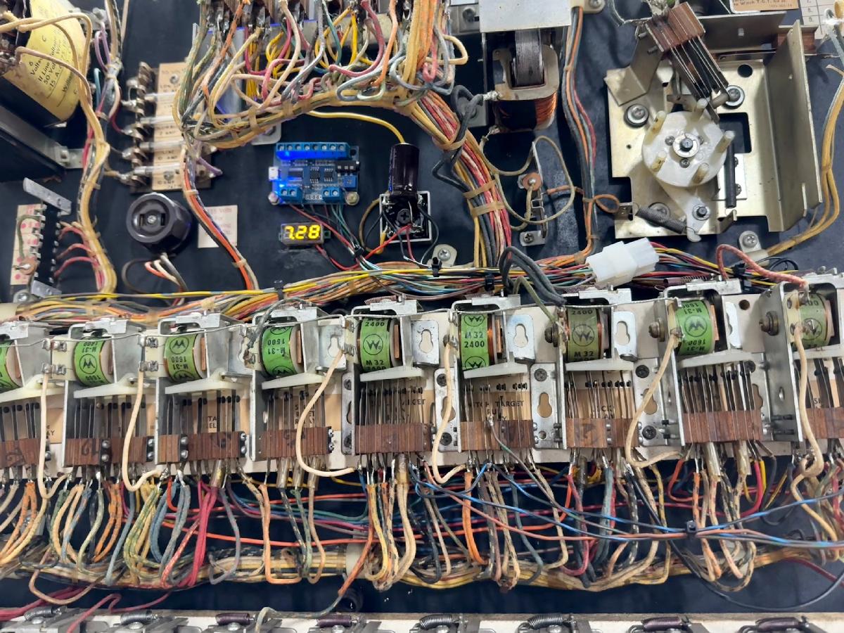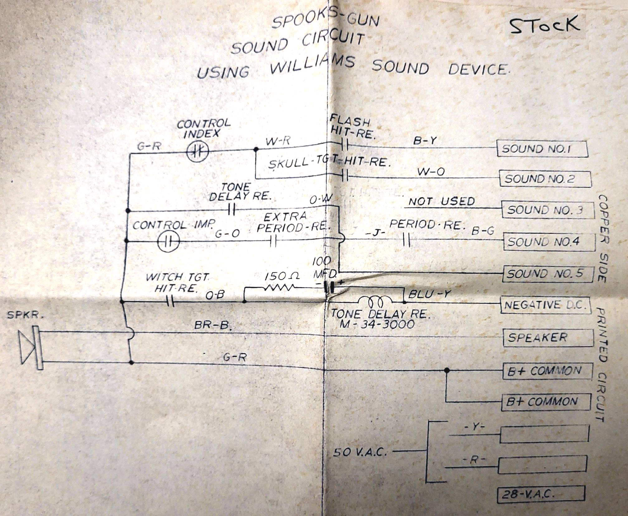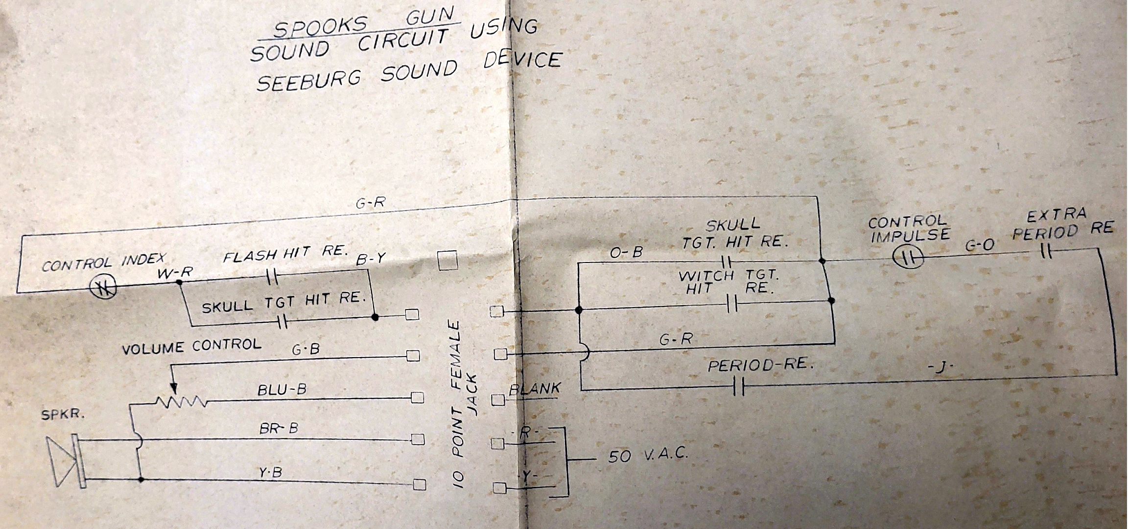 Note you can modify a switch at Index C position of the score motor (wht-red and grn-red) to make the sounds longer. If score motor switch #iC is permanently closed, it makes the "hit" sound for the Bullseye Flash and the Skull longer and more pronounced. The Witch uses the Sound relay (aka "Tone Delay relay") that is mounted above the sound board, and this has a 150ohm resistor and 100mfd 50v cap to keep this relay energized a bit longer. This sound relay activates from the Witch Target Hit relay. Changing this cap to 2200mfd 50v gives a slightly longer Witch hit sound (recommended.) There is one last sound produced, and that is activated thru the Extra Period relay and a Control Impulse switch on the score motor. It makes five quick tones if the player scores an extra period. If you are unimpressed with the electronic sounds, a switch can be added to the 10pt relay that goes to a 50v bell (you install.) I don't recommend both the bell and the electronic sound though, pick one or the other!