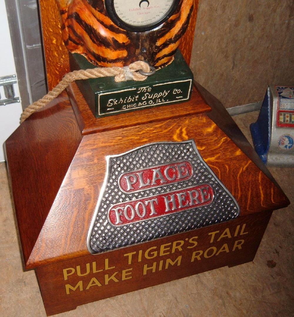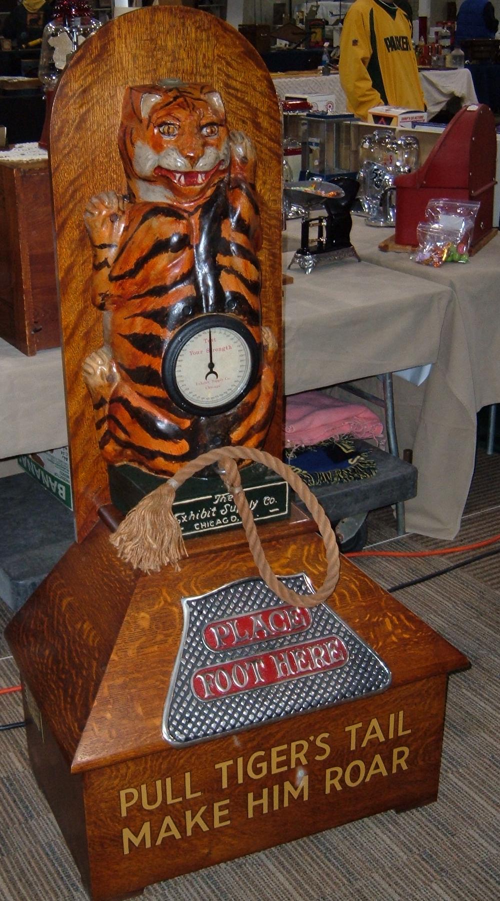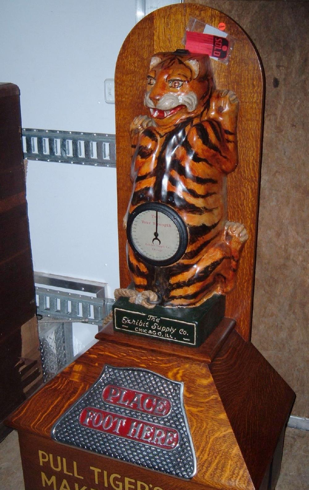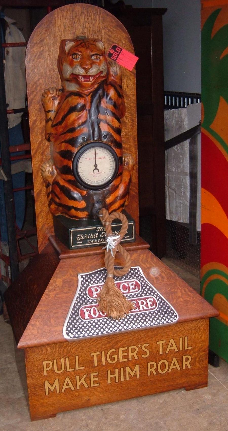 Description: Tiger Tail Puller, Exhibit Supply, 4/28, a stregth tester. Pull the tiger's tail and if you pull hard enough, the tiger "roars". Strength is measured on the large round meter. If you have an Exhibit Supply Tiger Tail Puller for sale, please contact me at cfh@provide.net