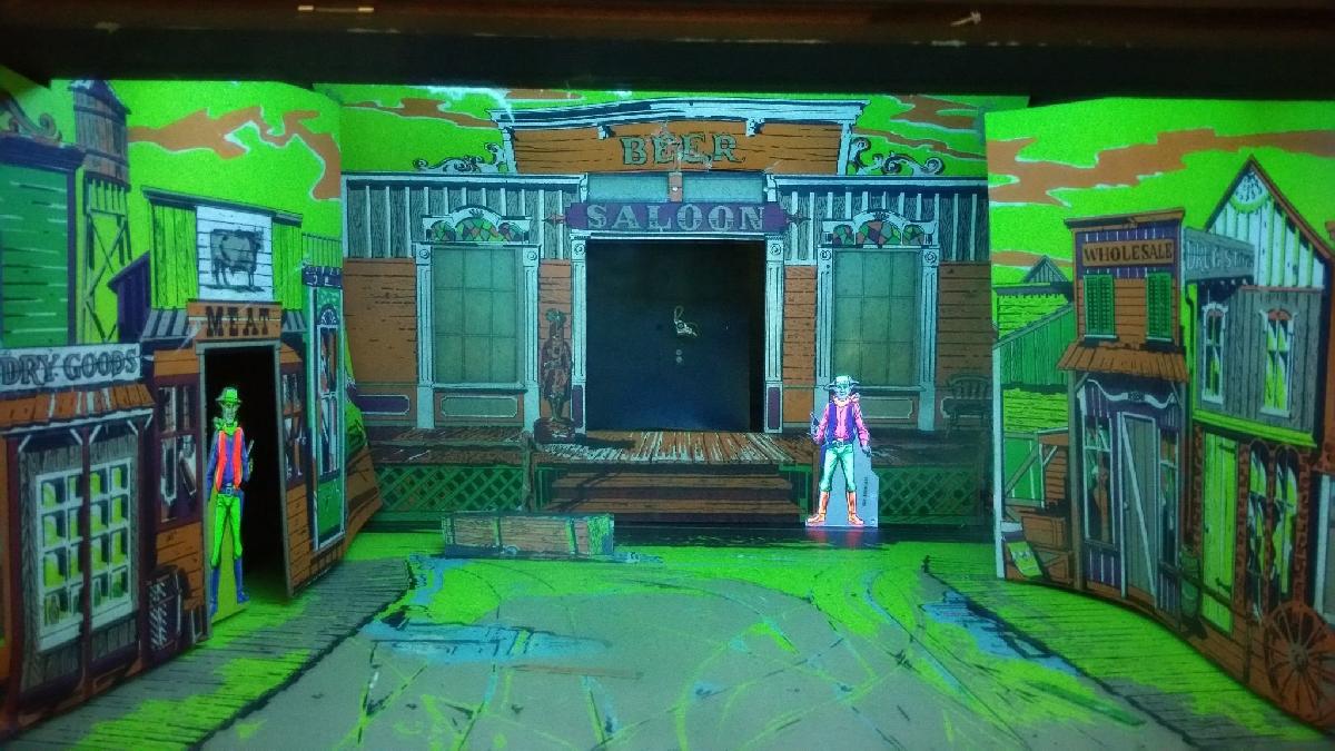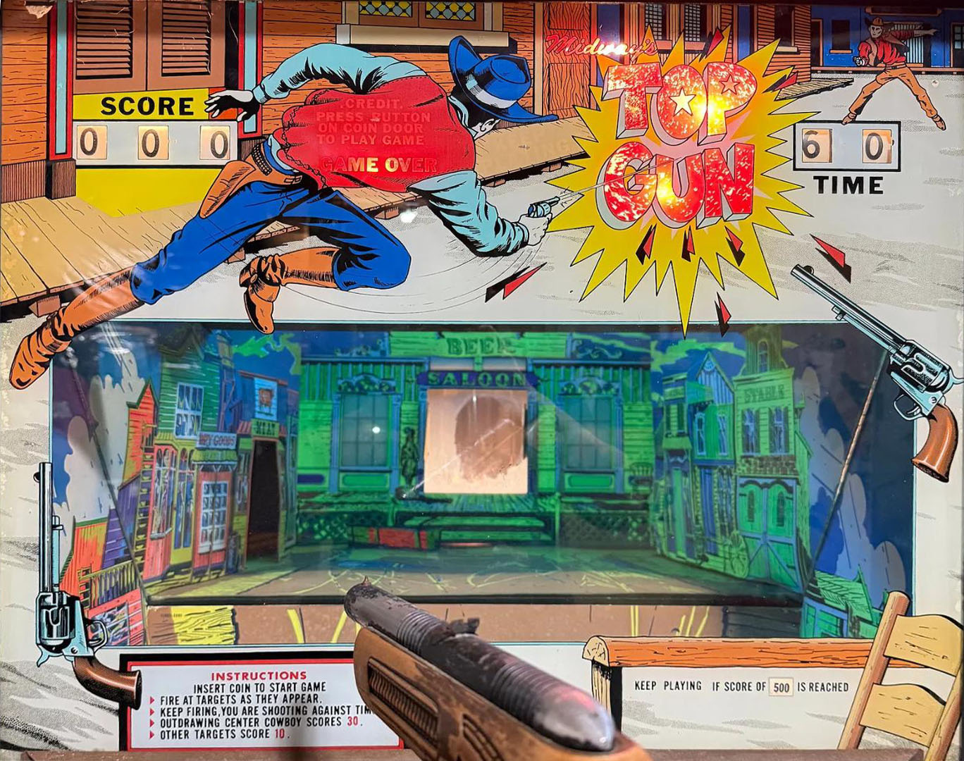 Description: TopGun, Midway, 1976. Last EM gun game made by Midway, and probably the last EM gun game by any of the game makers. Unlimited shots, it's a timed game, usually set to 60 seconds (though it is adustable to 80.) Western themed shoot-out game with six surprise pop up or light up targets. One target pops out of doorway on the right, another pops out out of doorway on the left, another is backlit from behind the water trough, another is backlit and shows up in the right window and another in the left window. But the main feature of the game is the center hologram target that appears when the center saloon doors open. The hologram appears quickly and disappears quickly, you must shoot him before he shoots you. A light above the hologram indicates if the game shoots the player first. It's a very cool feature. Unfortunately with time, the hologram drum fades and/or the membrane distorts, making this target less visible. The hologram is a circular flexible membrane drum that surrounds a motorized turntable and light bulb. A 100 watt light bulb turns on, and the motorized turntable rotates. To the player it looks like the gun fighter draws his gun and fires. A small 12v bulb lights behind the hologram to indicate the game's hologram gun fighter shot his gun. The hologram membrane itself is actually three seperate panels (draw, victory, and death scenes.) The draw hologram scene takes the most abuse, since it is "on top" when the game is not played. Meaning someone that cleans the mirror can accidentally drip Windex onto the hologram, and the draw scene is the area of the hologram that takes this hit. Also just general dirt falls on the top of the hologram drum, hitting the "draw" scene. Therefore it's the draw scene that's always in the worst condition of the three hologram scenes. As for operation, the hologram is tied to a motorized stepper unit, so the game knows where these three panels (draw, victory, death) start and stop. And the motor board controls the direction and speed of the hologram motor drum. In regards to the hologram, I have seen people replace a damaged hologram drum with stationary targets. The hologram drum is mounted on the motorized turntable. If the hologram is missing or damaged, replacing the hologram with a stationary target does work... kind of. It's obviously not the same effect, but better than having nothing! interestingly, this game uses standard EM type score reels. The motorized Midway score reel system is *not* used in this game! Perhaps because Bally bought Midway in 1969. The game uses Bally score reels and Bally relays. But oddly, the game uses 12volt bulbs (not the usual 6.3v) for all the general illumination behind the backglass. No background sound, but has electronic sound. Makes a "whirl" sound when you hit a target, and a gun shot sound when the trigger is pulled. There is recoil on the gun using a large solenoid. There are three electronic boards in the game: sound/amplifier, program timer, motor speed board. The motor speed board is used to control the hologram motor. Please contact me if you have this game for sale at cfh@provide.net