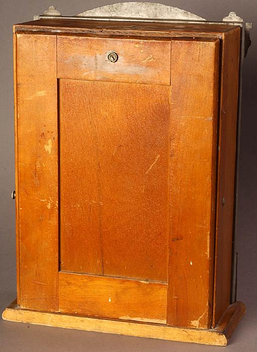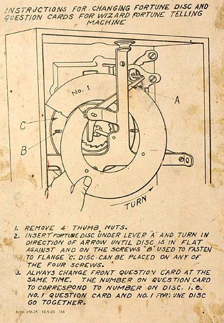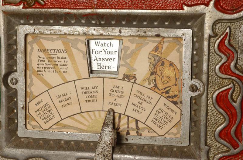 Description: The Wizard Fortune Teller, Mills Novelty Company, 11/26, metal table top fortune teller with a rotating paper disk that shows the patron's fortune. In the 1910s Mills Novelty made an early floor model spinning fortune teller. Then they made this countertop wood case model, the "Wizard" in the early 1920s. Then they made the final and best model, an aluminum cast front Wizard in 1926. You could select one of six questions, such as What will my future wife/husband look like, How can I get rich, etc. You then inserted a penny, pushed the plunger, and your answer was revealed in the open window. The front casting is what gives this game such a great look, with the wizard and his smoking incense pot. And of course, the Mills owl logo on the lower right. Please contact me if you have this game for sale at cfh@provide.net