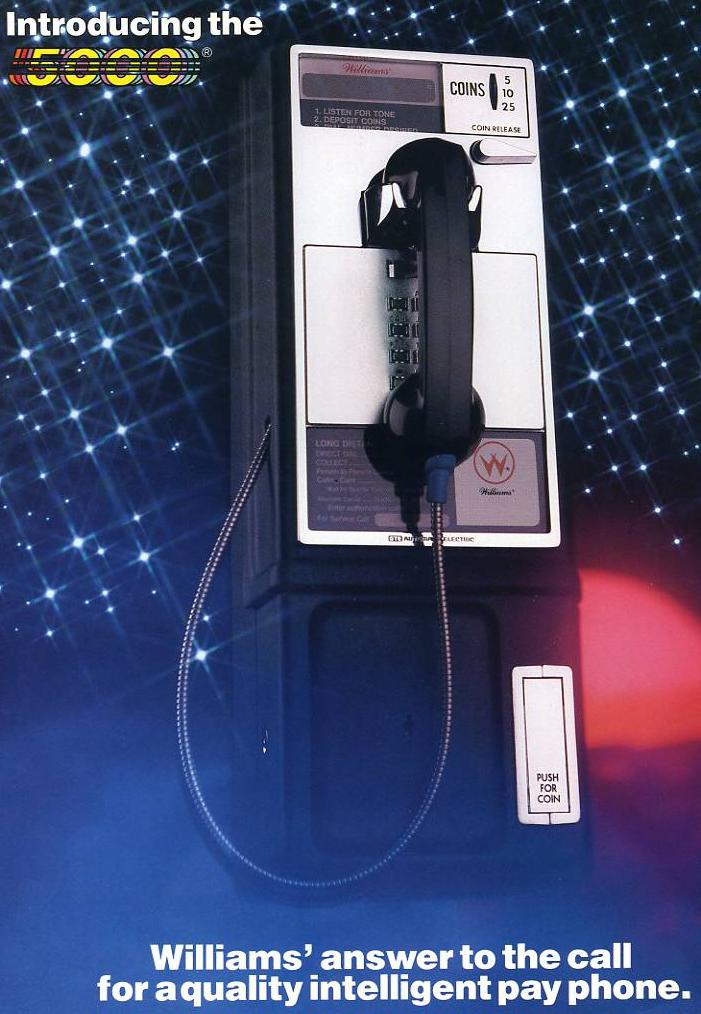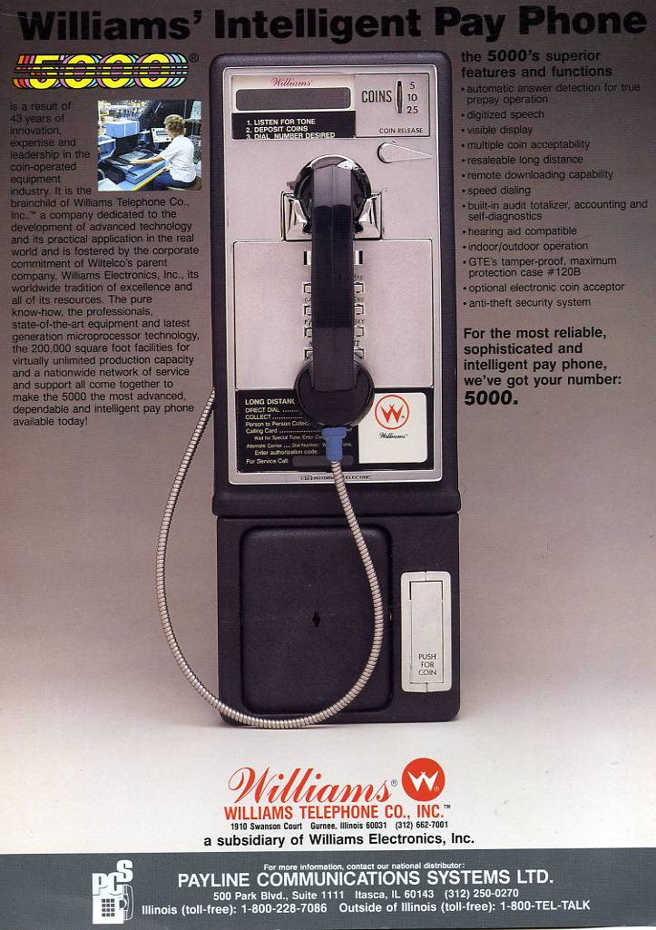 Description: Pay Phone 5000, Williams, 1985, a pay phone system sold by a pinball company. When telephone was deregulated in 1984, many companies got into selling payphones. Prior to this, only Ma Bell could and operate own a payphone, and they would collect all the payphone's money, and perhaps credit the location's phone bill $4 per month. But in 1984 anyone could own a payphone, and schedule long distance through any phone company they wanted, and keep all the money from the phone. Unfortunately competition was fierce, and many payphone vendors (including Williams) got out of selling payphone by 1986. |