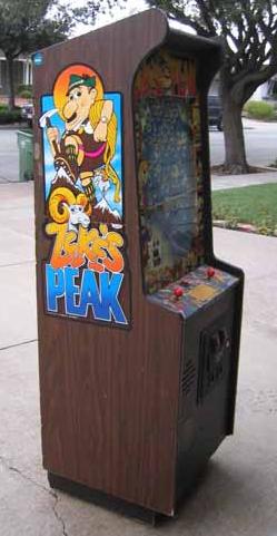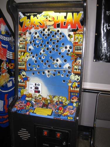 Description: Zeeks Peek, Taito, 1984. Try and use the two joysticks to tip a motorized bar back and forth, maneuvering a ball up to a specific lit hole on the playfield. Must avoid unlit holes. Upon game start, the ball and the bar go to the bottom of the vertical playfield, and a target hole is lit. The game starts with the bottom-most hole lit, and subsequent lit holes become more and more difficult to reach while avoiding unlit holes. The two joysticks control the height of the ends of the metal bar, which moves up and down the playfield, with a steel ball rolling back and forth on the bar. Solidstate technology. Similar to 1983 Taito Ice Cold Beer. If you have a Zeek's Peek for sale, please contact me at cfh@provide.net