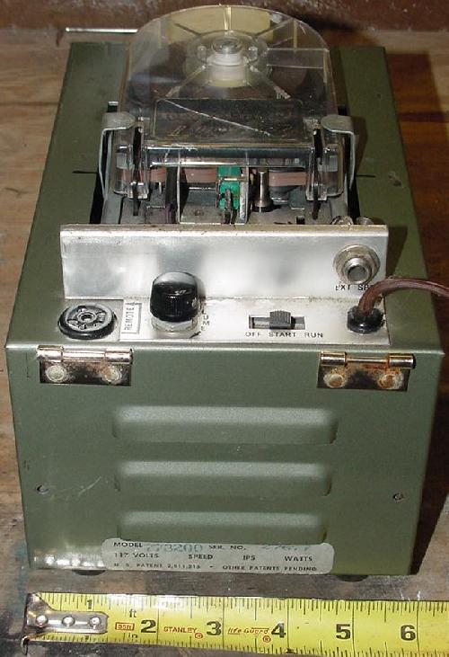 The Cousino endless tape player used in Zoltan has an interesting history. When Bernard Cousino put a 1/4" tape in an endless cartridge, he found that more than 45 seconds worth of tape loop would bind the tape. The problem was not only friction but static electricity. Cousino invented and patented a "double coated" tape. This tape was treated on the back with colloidal graphite, which lubricated the tape in the pack and also conducted away static. Cousino soon developed a cartridge specially adapted for endless audio tape that he marketed in 1952 known as the Audio Vendor, through his company Cousino Electronics. A fully enclosed version was later called the "Echomatic". Here's some pictures of the 1969 Cousino endless tape player that was used in Zoltan, model number 773200.