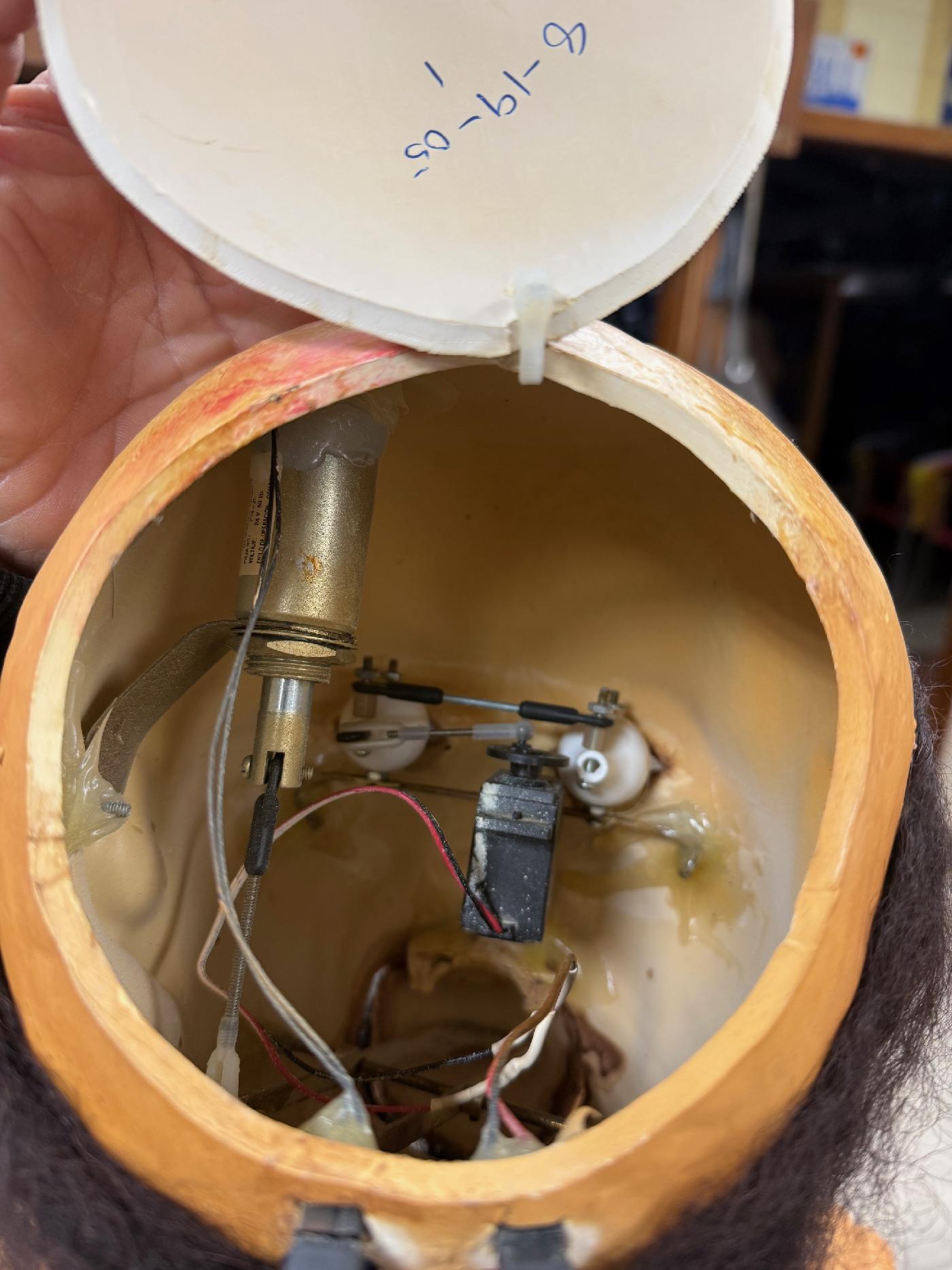 Inside the back of Zoltar's head. This shows the servo motor used for eye movement and the jaw solenoid.