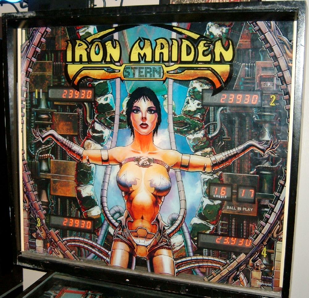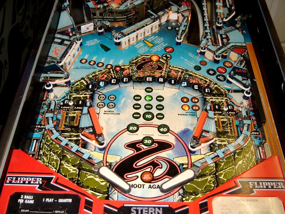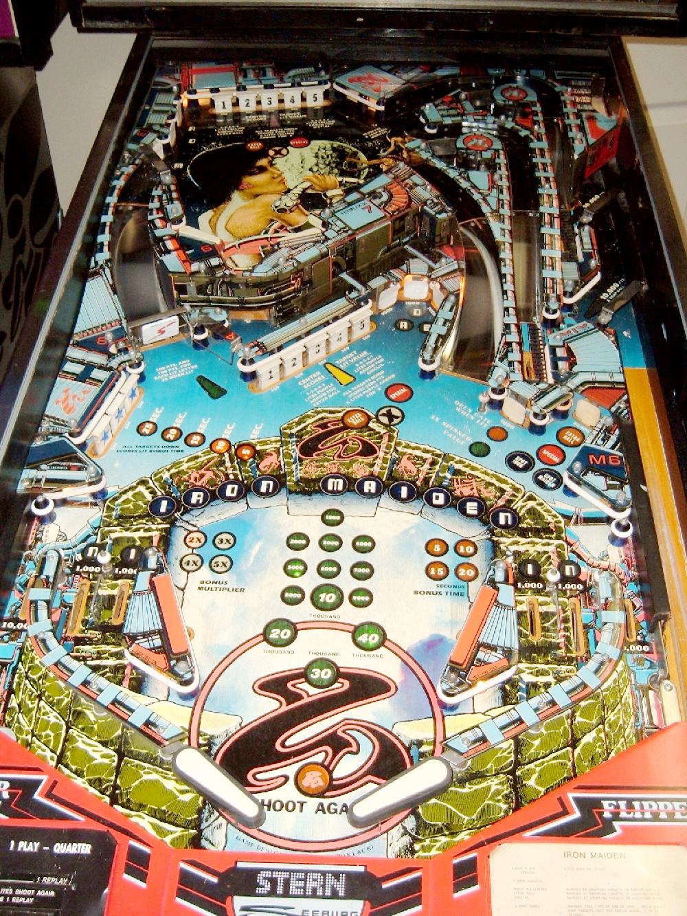 Description: Stern Iron Maiden pinball, 10/81, MPU-200 CPU board, Sound SB-300 board. No speech known to exist, but there is a rumor that there's speech ROMs out there somewhere for Stern Iron Maiden pinball. I personally love this game, it's really cool looking. Behind the backglass there is a "heartbeat" lamp that progressively glows and dims. Very cool effect. Dual level playfield with the upper PF having two 2" flipper. Lower playfield has two 3" flippers. I like the game play - From the shooter lane, lock the ball into the "ball walker", which is behind the lower PF's five drop targets. (There's a blue lit insert that the player must aim for.) Get two balls locked, then spell IRON MAIDEN. Now you're ready for 3-ball multiball. On the upper playfield put a ball into one of the right side runways, and you're rewarded with multiball. If you have a Stern Iron Maiden pinball for sale, please contact me at cfh@provide.net Other Stern Pinballs I am looking for: