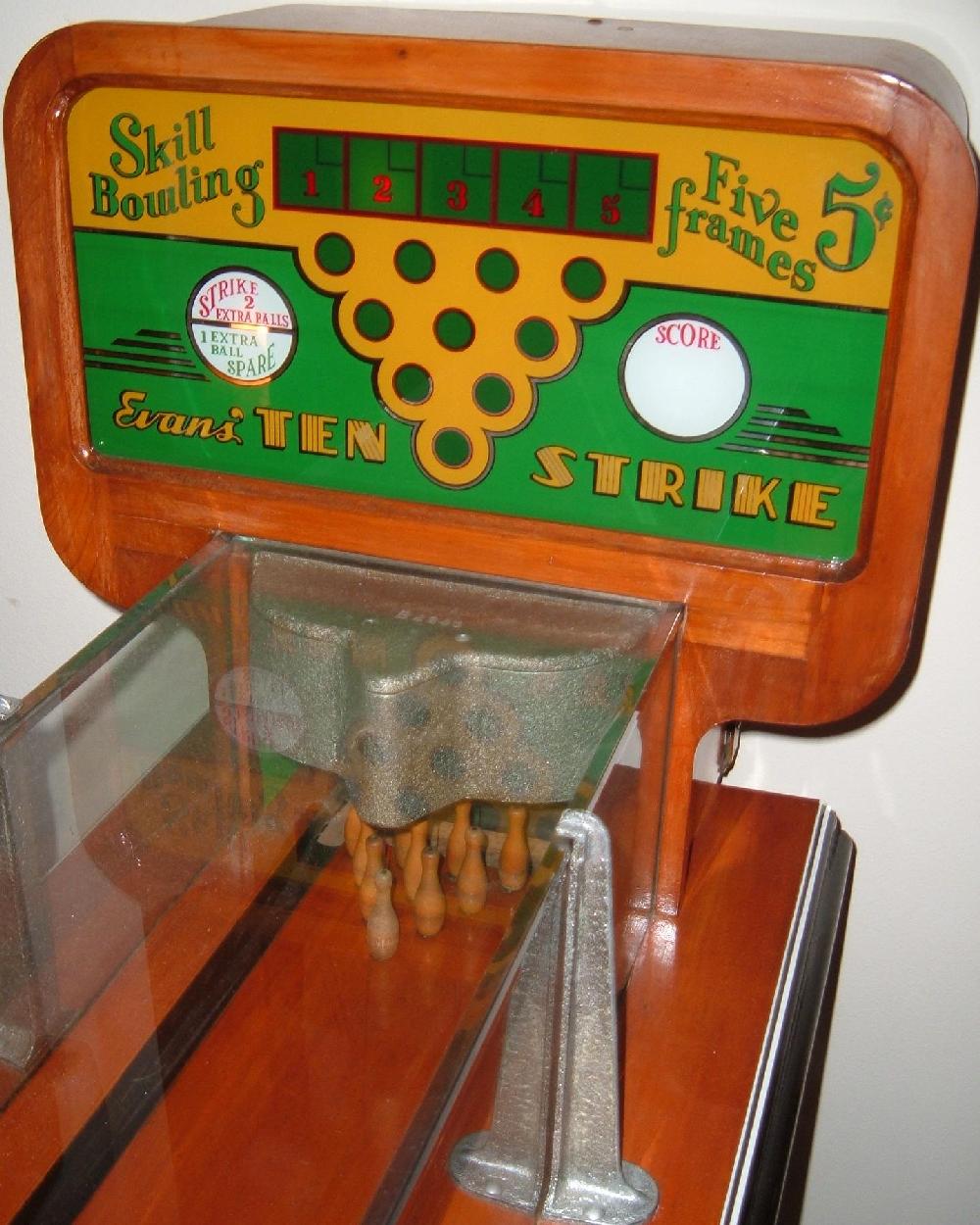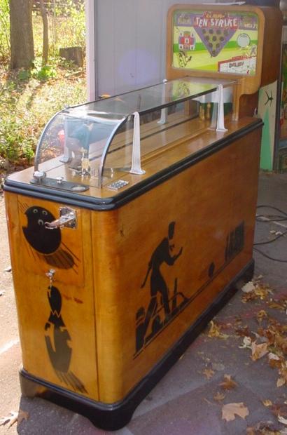 Description: Ten Strike, Evans, made from September 1939 to January 1953 in several different variations, mechanical manikin bowling bowler game. Less than 100 point scoring is shown on backglass using a rotating backlit score reel type device, which projects through a magnifier onto the score glass. Thousand scoring is shown in a conventional backlit lighting manner. Game uses two 1.25" balls and only plays five frames (instead of the usual 10 frames). First generation pre-WW2 (1939-1942) version has a green and yellow backglass with "Ten Strike" at the bottom of the glass. Post-War second generation (1947-1948) version has a green pin triangle with red pins and "Ten Strike" at the bottom of the glass. The third generation (1949-1953) version with light animated bowler man throwing the ball (showing which pins have been hit) and has "Ten Strike" at the top of the glass. The schematic and patent info for this game is available here. If you have this game for sale please contact me at cfh@provide.net Rockola also made a licensed version of 10 Strikes during 1940-1941. The Rockola game was call Ten Pins (10 Pins). Evans also made some other bowling type skee-ball games based on their 10 Strike game, including Ski-Ball (1940) and In the Barrel (1940). Gottlieb also had their Skee-ball-ette (1940). During WW2, there were several revamps of the game, including Supreme BolaScore (Bowlascore), Valley Speciality Bank-A-Ball, and Mike Munves Thunderbolt. Evans went out of business in 1955, and the manikin bowler idea (and apparently the "little man" tooling) was bought by Williams and used in their December 1957 "Williams Ten Strike" and "Williams Ten Pins", and later in their 1970 Williams Mini-Bowl, and even Sega's Pro-Bowler (1972). The Williams 10 Strikes (and later games) look completely different than the Evans 10 Strike, other than the mannequin. If you have one of these games for sale, please contact me at cfh@provide.net |