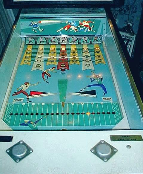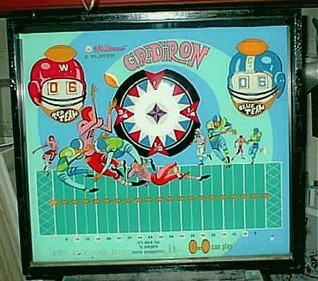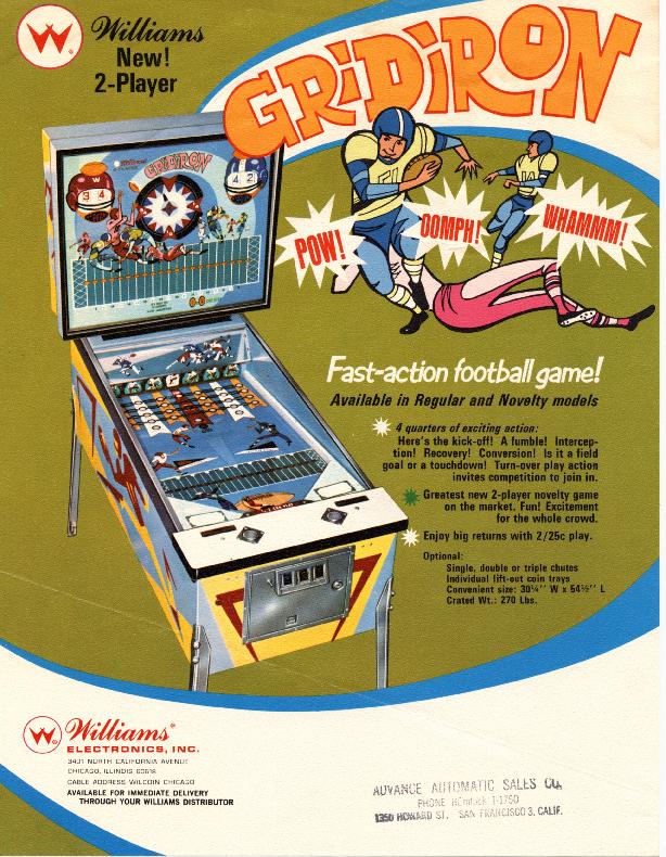 Description: Gridiron, Williams #376, 10/69, two players, pitch and bat with a football theme, available novelty or replay, red and blue score dials, foot-shaped plastic over bat (which is usually missing or broken). |