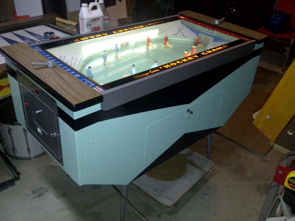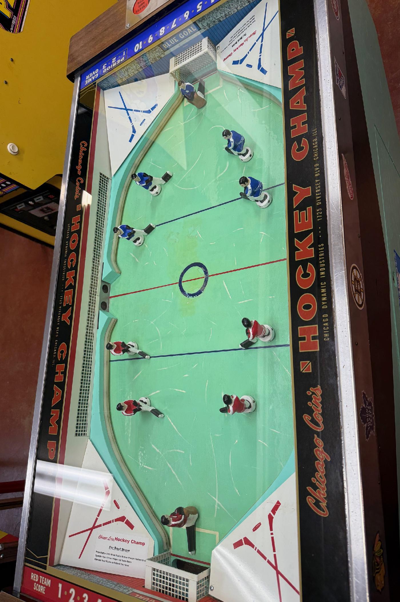 Description: Hockey Champ, Chicago Coin, 11/68, two players. Of all the EM coin op hockey games, this is probably the best variant. Instead of motorized goalies which the player has limited control, this game is essentially a head-to-head pinball machine. Each player has right and left flipper buttons, that flip their players (4 players plus a goalie), which allows great control (both offense and defense.) The flippers (players) are single wound 23-550 impulse style flipper coils, but the game essentially plays like say the 1983 Williams Joust head-to-head pinball machine. A very unique EM arcade game. Note the game came with several different flipper button configurations. The most common is two small buttons for each player. But this game was also made with two larger buttons, or even a Galaga-style left/right metal joystick. Note the game flyer below shows the large button format. Also the game has three periods, with a buzzer sounding at the end of the third period. Total game time is adjustable from 2 minutes to 5 mintues. There is also a large #81 red light bulb above each goal and a bell to signify a scored goal. Maximum goals per side are 19 (that's all the steppers will allow.) There is a motor that alternates center ice face-off (ball) delivery on either the red or blue teams' side of the center red line. This keeps the player fair. Also the game can only be played as a two player game. That is its only drawback. If you have a CCM Hockey Champ for sale, please contact cfh@provide.net