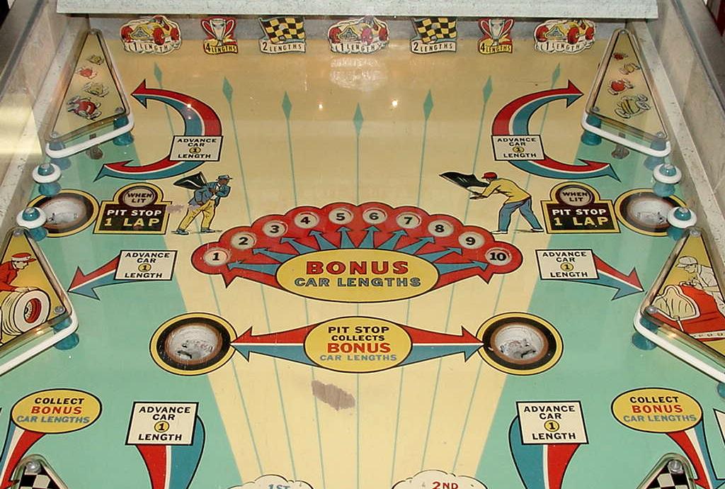 Description: Race Way, Midway, 9/63, two player pinball, auto racing pinball style game but with a racecar "running man" type unit, similar to Flying Turns (1964) and Winner (12/64), uses real "Dinky Toy" cars (one Ferrari, one Maserati) in the backbox. Cars move around the track using magnets as the player shoots pinball. Top glass is 23" x 34 7/8" x 3/16" tempered glass. Raceway has a center turret ball kicker. Under the race track there are two motors that drive two sets of gears via two chains. There is a magnet attached to each chain, and the cars have magnets on their underside. This is how the cars are moved. The score is the number of laps each car takes. There's a switch under the racetrack for each car, and as the magnet comes around, the switch momentarily closes, advancing the player one or player two score reel one position. (The outside blue car is player one, the inside red car is player two.) Replays are score is the player gets to a set number of laps (operator adjustable starting at 8 laps). The targets across the top of the playfield move the car the number of lengths specified (1, 2 or 4 lengths). The two pairs of kickout holes can really advance the cars. There are four slingshot kickers, an upper and lower pair that each move the car "one length", which is about 4 inches (1/4 revolution of the motor that drives the cars). When any of the four slingshots are hit, the bonus goes up one, to a maximum of 19. If the ball goes into one of the lower kickout holes, the bonus is scored, and a the car is moved one length for each bonus number (the bonus does not score when the ball is drained). The bonus also holds over to the next player (or ball), if the current player/ball can not collect it. Interestingly, when a new game is started, the bonus is cleared, but only 10 positions. So if the bonus is higher than 10, a new game will be started with the bonus above "1". The top two kickout holes will advance the car one lap, but only when lit. Otherwise they only move the car about one length. Likewise the outlane drains will advance the car a 1/2 lap, but again only when lit. Otherwise they score nothing. Game reset is a bit different. Starting a game will clear both player's score reels. Then the game moves both red and blue cars around the track one to the starting line. This happens even if both cars are already at the starting line. Then game is ready to play by pressing the lockdown bar's ball eject button. I found that often upon starting a game the two cars would not reset themselves and go around the track to the starting line. This was usually caused because the 2nd Coin relay would be energized, so the game would start as a two player game (instead of first starting as a one player game - a switch on the 2nd Coin relay stops the cars from reseting). This happens often because the 2nd Coin relay has become magnetic. Using a piece of electrical tape on the 2nd Coin relay's activator plate usually fixes this. If you have this game for sale please contact me at cfh@provide.net