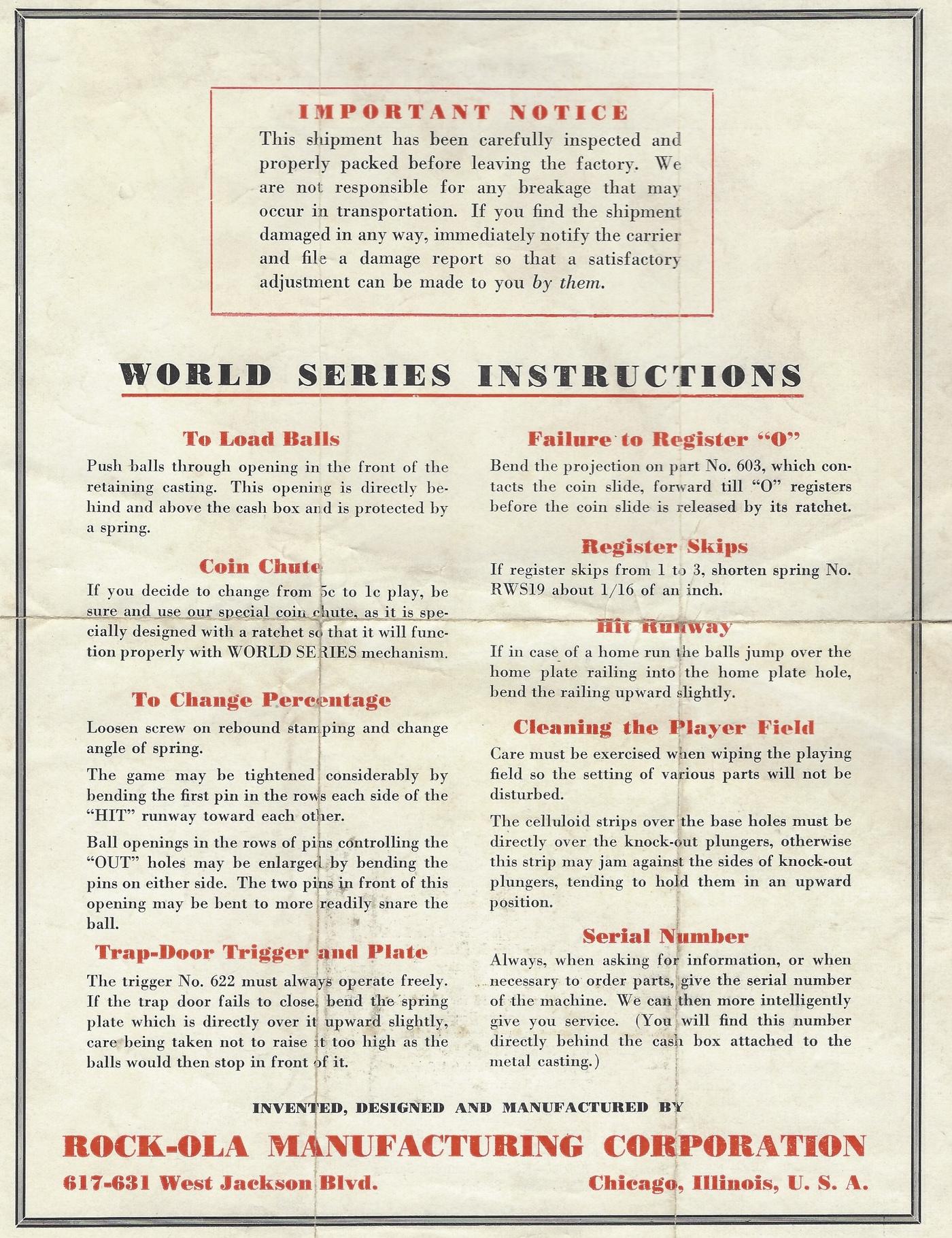 See some other Rockola pre-war pinballs: If you have a 1934 Rockola World Series baseball game for sale please contact me at cfh@provide.net