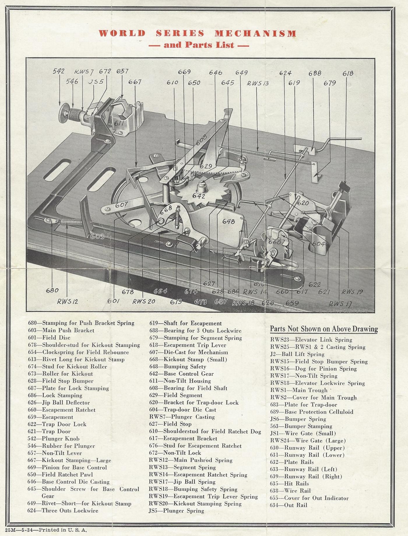 Description: World Series 1934 baseball pinball, Rockola, 5/34, a pure mechanical pinball game (uses no electricity), not a pitch and bat, uses a standard pinball type cabinet. Header denotes Play Ball! A very cool little game where if the player gets a hit, the ball is feed to a "infield". This is mechanical animation where the balls show the players on base. Kind of strange in that home plate is furthest away from the patron, which is unlike all the other pinball pitch and bat games. One problem often seen on this game is the metal "hit" ball feeder from the playfield to the moving infield is pot metal, and often is very deterioated. These are impossible to find, and without it, the game is basically useless. This game was reissued in 1951 by Chicago Coin in a larger electrical format as their Play Ball!.