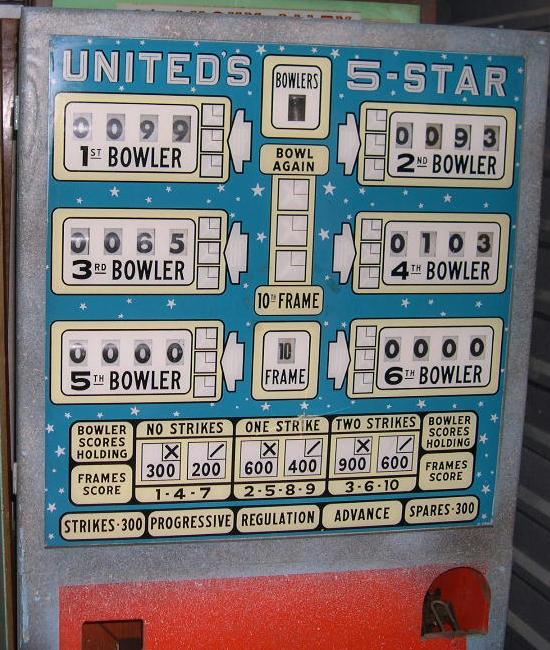 Description: 5 Star Bowler (bowling alley), United, 3/61, 4.5" balls, five different games, first United ball bowler with 5 different games, last United game with no pin indicator hood. If you have this game for sale I would love to buy it. Please contact me at cfh@provide.net