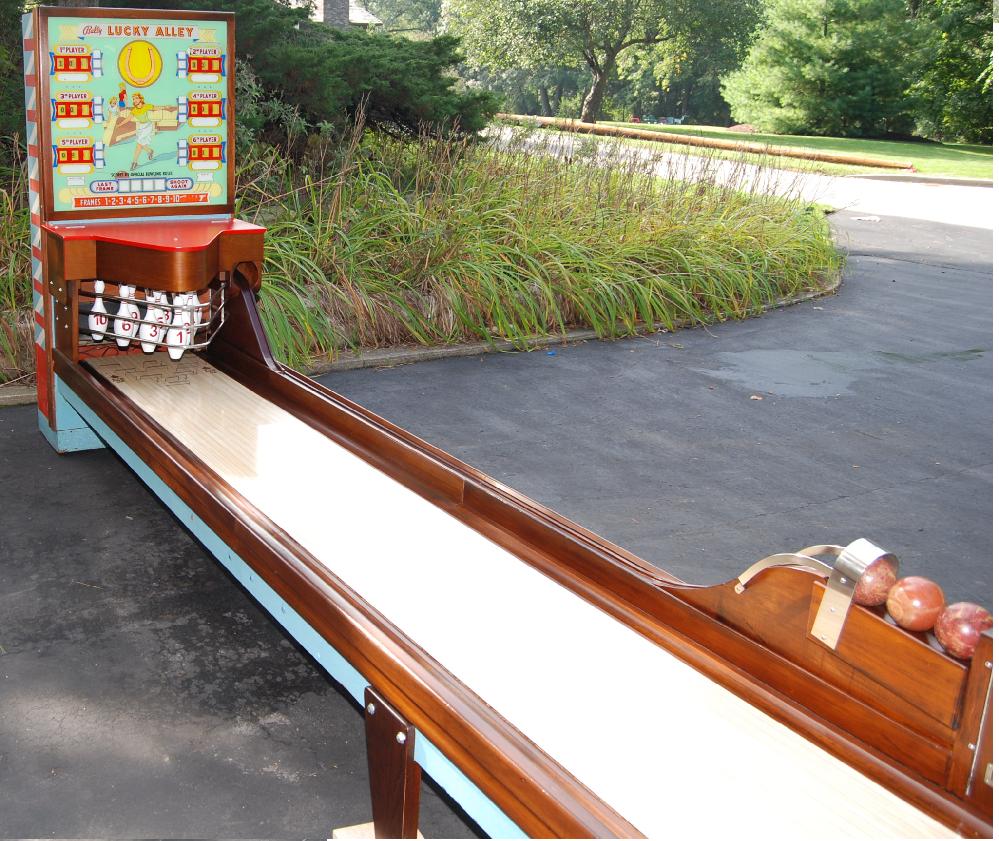 Description: Lucky Alley (bowling alley), Bally, 8/58, 4.5" balls, made as both a normal and as a contact style bowler. If you have a Bally Lucky Alley bowling alley for sale please contact me at cfh@provide.net
