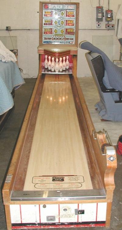 Description: Bowling League (bowling alley), Chicago Coin, 2/57, Chicago Coin's first ball bowler, 3" balls (this is the only ball bowler CCM made with 3" balls), gutters (unlike United and Bally 3" ball bowlers), glass shelf below pins, handicap button. The handicap is an interesting feature. This button (located at the front of the game on the coin door) allows any player to increase their score in 10 point increments in any frame at the beginning of the frame. This allows a player to be spotted 10 (or more) points. "I bet you I can beat your score and I'll spot you 20 points."