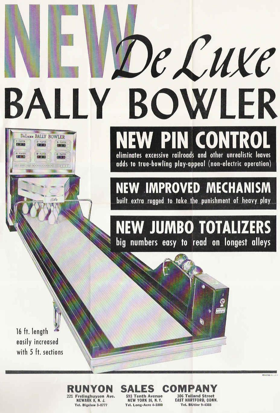 Description: Deluxe Bally Bowler (bowling alley), Bally, 12/63, 16 feet (additional 5 foot sections available too), big number score reels. Basically the same game as the 1964 Bally Bowler and 1965 Bally Bowler and 1966 Bally Bowler and 1969 Bally Bowler. If you have this Bally Ball Bowler for sale please contact me at cfh@provide.net
