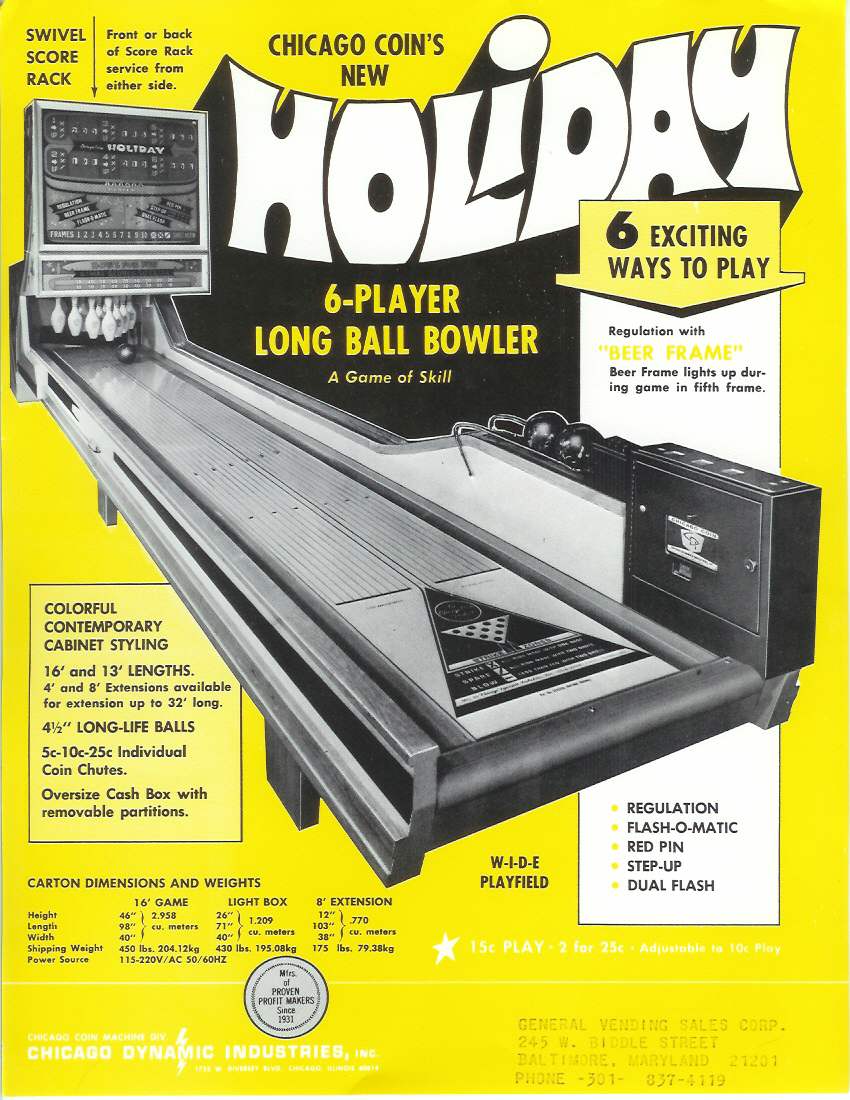 Description: Holiday (bowling alley), Chicago Coin, 1972. Not to be confused with United's Holiday (1962). If you have a Chicago Coin Holiday bowler for sale please contact me at cfh@provide.net