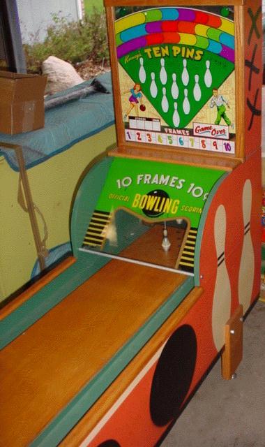 Description: Ten Pins, Keeney, 1949, a roll-down type bowling game which uses small 2" balls rolled down at shuffle alley. The Keeney 10 Pins' balls hit small pins, which retract through a string. The pins are held to the alley with magnets (this is the same concept used on the 1957 Williams Ten Strike/Ten Pins and the 1939-1953 Evans Ten Strike). The ball is returned to the player at the front coin door area via gravity. The Keeney Ten Pins is perhaps the first ball bowler, and definitely the first contact ball bowler. It is essentially a single player mini version of the 1960 United Bowlarama. If you have a Keeney Ten Pins for sale please let me know at cfh@provide.net