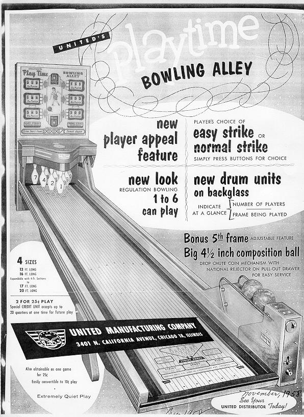 Description: Playtime Bowling Alley, United, 11/58, 4.5" balls, 13/16/17/20 foot lengths, player selectible "easy strike" or "normal strike" feature (changes the lane switch combination required to obtain a strike). If you have this game for sale I would love to buy it. Please contact me at cfh@provide.net