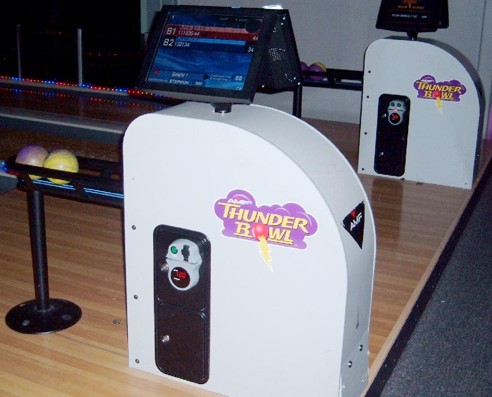 Description: Thunder Bowl, AMF, recent (exact date unknown), 5" balls (3.5 pounds), about 30 feet lane (compared to Bowlarama's lane at 20 foot), under the lane ball return system. Thunderbowl is an undated version of Bill Jonesi's original United Bowlarama (1960). Thunder Bowl has pins attached by cables, so they are free-floating and can knock over adjacent pins. Thunderbowl is basically a slightly smaller coin operated version of real bowling. Uses a 15" LCD flat touch screen monitor for scoring (including some neat animations between frames). Sold as a pair of lanes (not singular). Thunderbowl is not a movable bowler like the traditional coin-op ball bowlers, but is much bigger and well attached to a stationary position. The price for a game was $3 (compared to the 10 cent games on an original 1960 Bowlarama!) AMF provides technical specs and revenue specs.