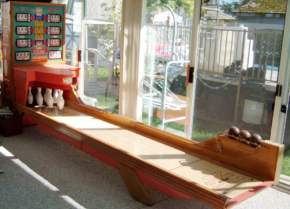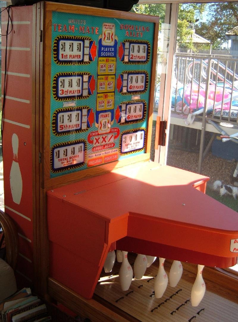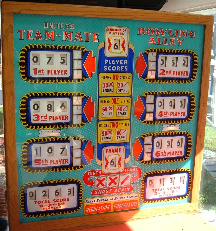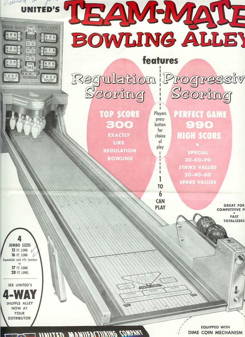 Description: Team-Mate Bowling Alley, United, 12/59, 13/16/17/20 foot lengths, 4.5" balls, player choice of Regulation (300 point max) or Progressive (990 point max) scoring games. Game also has two additional sets of score reels for team play. It totals the points for players 1,3,5 for one team, and totals the points for players 2,4,6 for the other team. If you have one for sale please contact me at cfh@provide.net