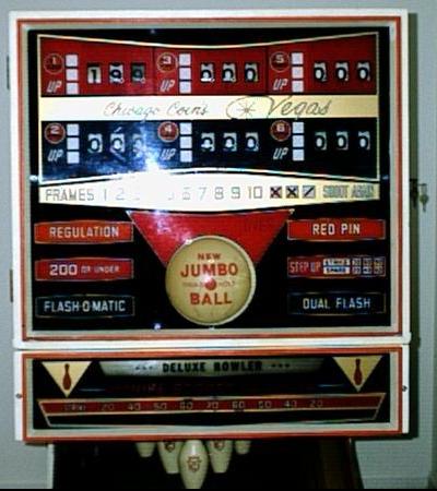 Description: Vegas Bowling alley, Chicago Coin, 1967, giant oversized 6" balls with a single thumb holes (but can be used with standard 4.5" balls too), lazy susan swivel score rack, 6 games, very similar to CCM Flair (1966). If you have this game for sale I would love to buy it. Please contact me at cfh@provide.net