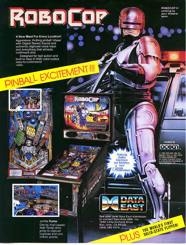 Description: Description: Robocop, Data East, 11/89, Multiball and has speech. A licensed theme, 1500 units produced. If you have a Dataeast Robocop pinball for sale please contact me at cfh@provide.net