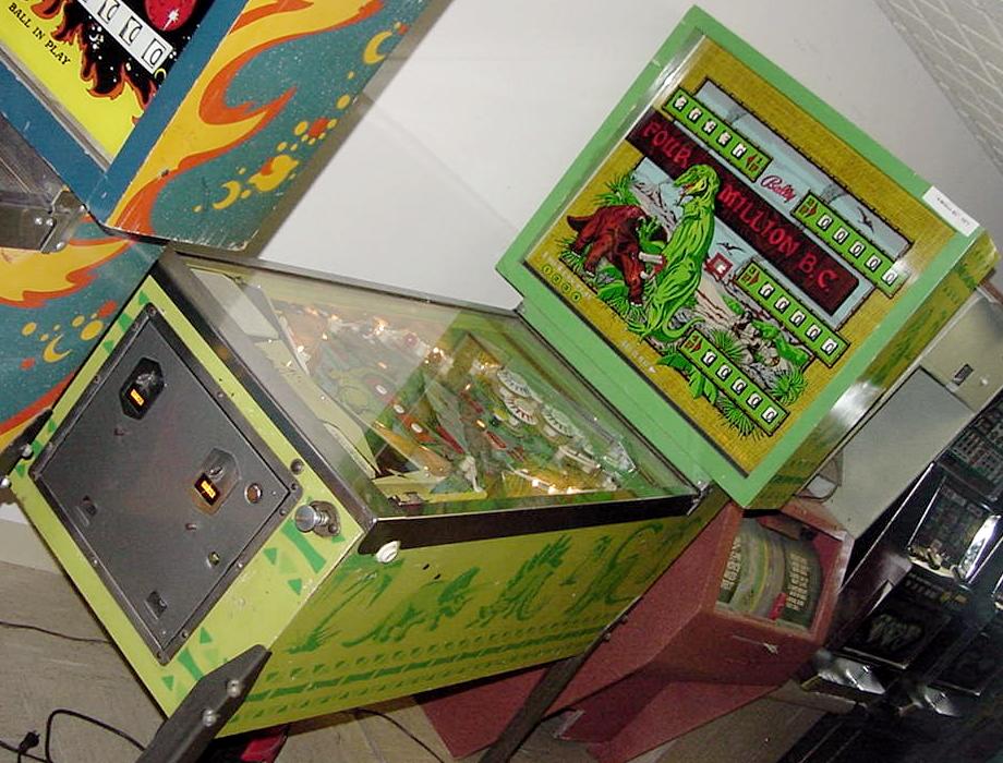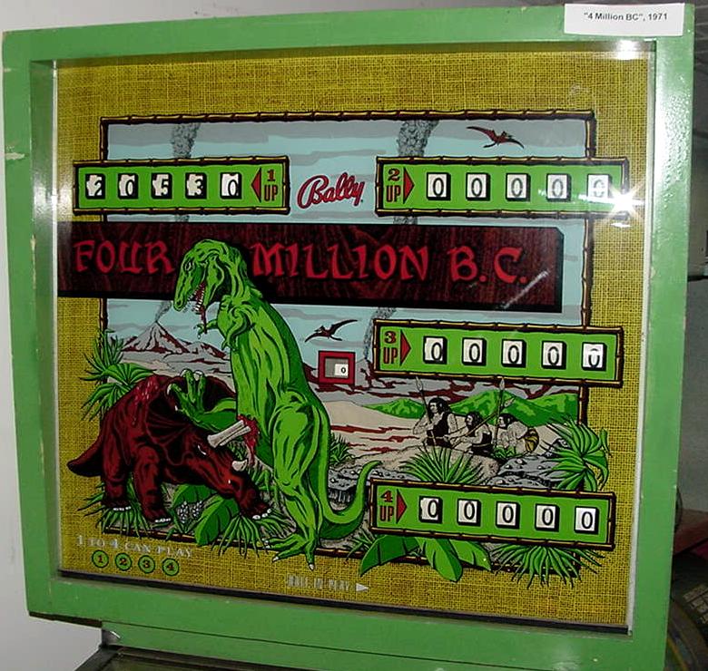 Description: Bally Four Million BC pinball, 4 players. Has up to 3 ball multi-ball and zipper flippers (flippers that move inward). Very cool skill shot and "tar pit" ball lock feature for one of the multiball loads. Unfortunately only has high score specials, no bonus, no extra ball, no playfield specials. They made 3550 Bally 4 Million B.C. pinballs. If you have a Bally 4 Million BC pinball for sale, please contact me at cfh@provide.net