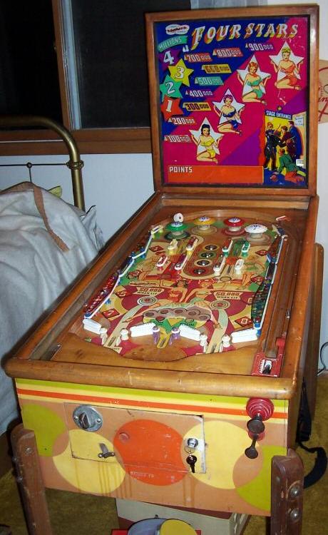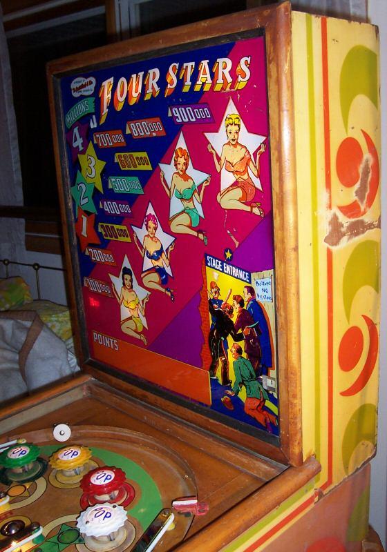 Description: Four Stars, 6/52, 950 produced, 4 trap holes, 4 flippers, very similar to Quartette. Woodrail pinball, artwork by Roy Parker.